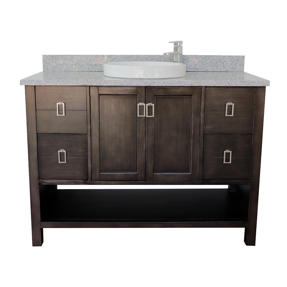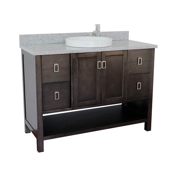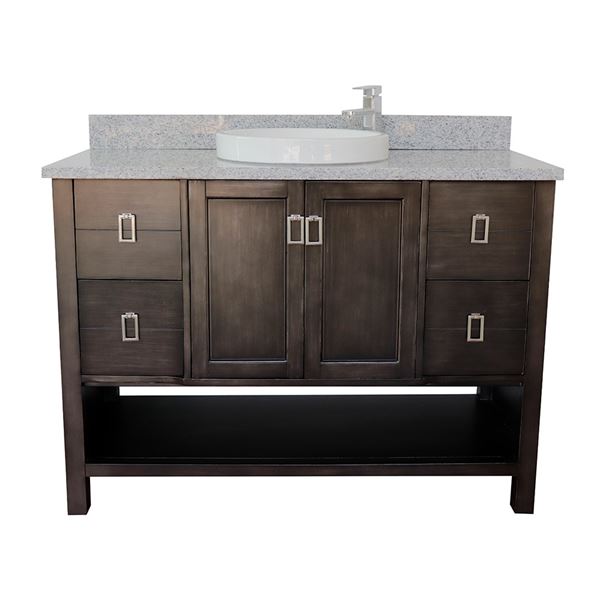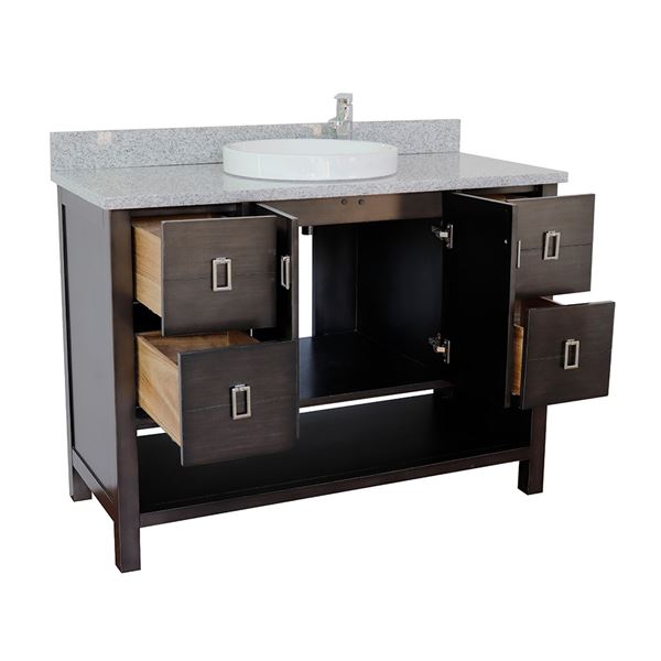 Wood and veneer over plywood construction, no MDF or particle boardEach cabinet is configured to work with our variety of countertops or any standard sized topsFull corner block on all corners for stabilityHand applied with multiple layers of ecofriendly stain and top coat to prevent pealing, cracking and fadingSolid nickel finish hardware Soft-close hinges offer 110-degree opening capabilityEnglish dovetail drawer constructionFull size and extra-deep drawersGenuine Granite, natural materialcUPC certified white ceramic sink factory pre-installed, no assembly required1.3 in. (33mm) thickness eased-edge elegant lookVanity top is pre-drilled with one faucet hole for a single hole faucet (faucet not included)