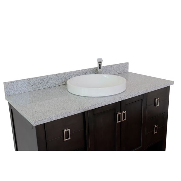 The Monterey collection by Bellaterra Home features a simple style of bathroom vanities that can accomplish any home design. From the cottage to the cabin or to the grand home design, you will appreciate this beautifully hand crafted piece of furniture as the focal point in your bathroom. The structure of the cabinet is built with solid oak and has full corner blocks on all corners for stability and to also provide additional support for the counter top. The 4 extra deep full-size drawers are constructed with English dovetail and installed with smooth under mount full extension glides. It provides durability and ample storage. It is hand applied with multiple layers of ecofriendly stain and top coat to prevent pealing, cracking and fading. The interior finish is consistent throughout and matches the exterior finish. The 2 center doors open to one big storage space that can be configured to fit personal storage needs. Solid nickel finish hardware completes the elegant look. The bottom of the cabinet has an open shelf for additional storage or for decorative items. Each cabinet is configured to work with our variety of countertops or any standard sized tops. This collection is offered in two different finishes, Sable Brown (Dark brown) and White. This elegant bathroom vanity top features a 1.3in. thick genuine stone top preinstalled with a white cUPC certified ceramic sink and a matching backsplash is available for additional purchase for the utmost beauty and functionality. It will easily match many home interiors. Our vanity tops are pre-drilled with faucet holes. Bellaterra Homes counter tops are pre-sealed and polished for added protection. All genuine stone material has its variation of veining pattern and color; every top will be slightly different.