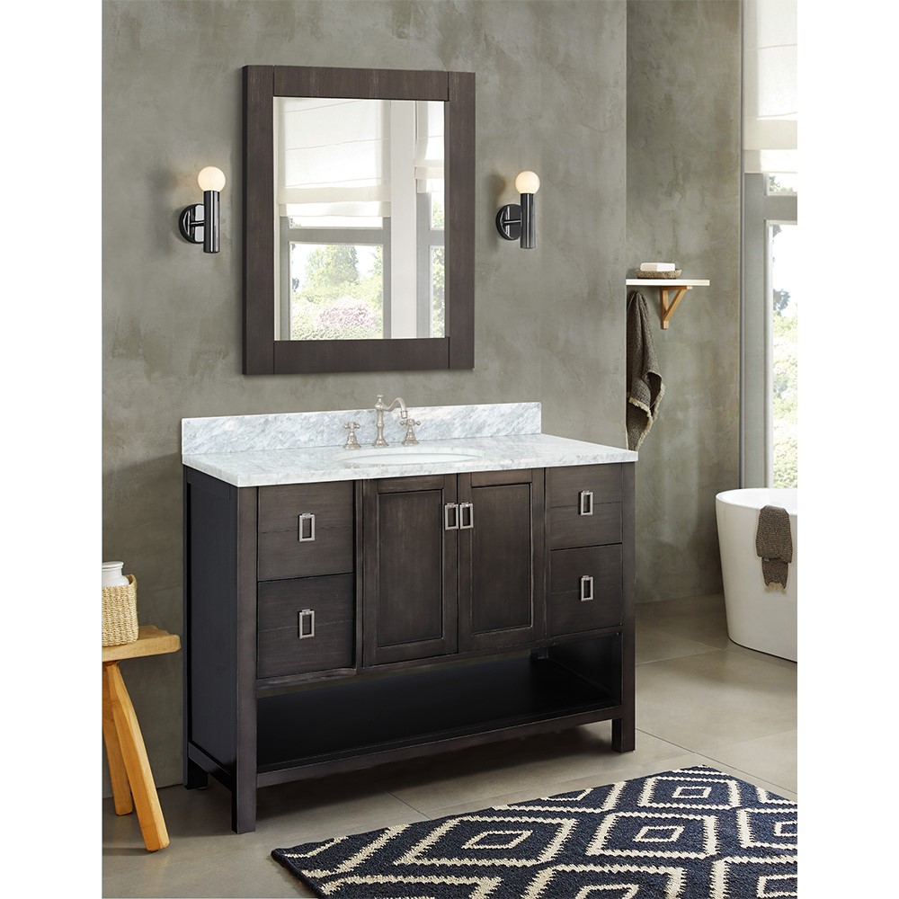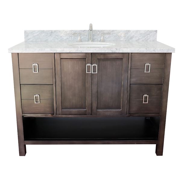 The Monterey collection by Bellaterra Home features a simple style of bathroom vanities that can accomplish any home design. From the cottage to the cabin or to the grand home design, you will appreciate this beautifully hand crafted piece of furniture as the focal point in your bathroom. The structure of the cabinet is built with solid oak and has full corner blocks on all corners for stability and to also provide additional support for the counter top. The 4 extra deep full-size drawers are constructed with English dovetail and installed with smooth under mount full extension glides. It provides durability and ample storage. It is hand applied with multiple layers of ecofriendly stain and top coat to prevent pealing, cracking and fading. The interior finish is consistent throughout and matches the exterior finish. The 2 center doors open to one big storage space that can be configured to fit personal storage needs. Solid nickel finish hardware completes the elegant look. The bottom of the cabinet has an open shelf for additional storage or for decorative items. Each cabinet is configured to work with our variety of countertops or any standard sized tops. This collection is offered in two different finishes, Sable Brown (Dark brown) and White. This elegant bathroom vanity top features a 1.3in. thick genuine stone top preinstalled with a white cUPC certified ceramic sink and a matching backsplash is available for additional purchase for the utmost beauty and functionality. It will easily match many home interiors. Our vanity tops are pre-drilled with faucet holes. Bellaterra Homes counter tops are pre-sealed and polished for added protection. All genuine stone material has its variation of veining pattern and color; every top will be slightly different.