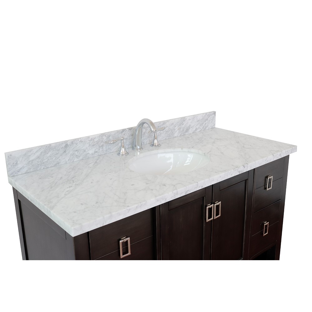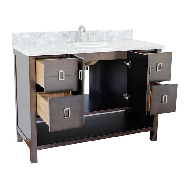 Wood and veneer over plywood construction, no MDF or particle boardEach cabinet is configured to work with our variety of countertops or any standard sized topsFull corner block on all corners for stabilityHand applied with multiple layers of ecofriendly stain and top coat to prevent pealing, cracking and fadingSolid nickel finish hardware Soft-close hinges offer 110-degree opening capabilityEnglish dovetail drawer constructionFull size and extra-deep drawersGenuine White Carrara marblecUPC certified white ceramic sink factory pre-installed, no assembly required1.3 in. (33mm) thickness eased-edge elegant lookVanity top is pre-drilled with 3 faucet holes for an 8 in. widespread faucet (faucet not included)