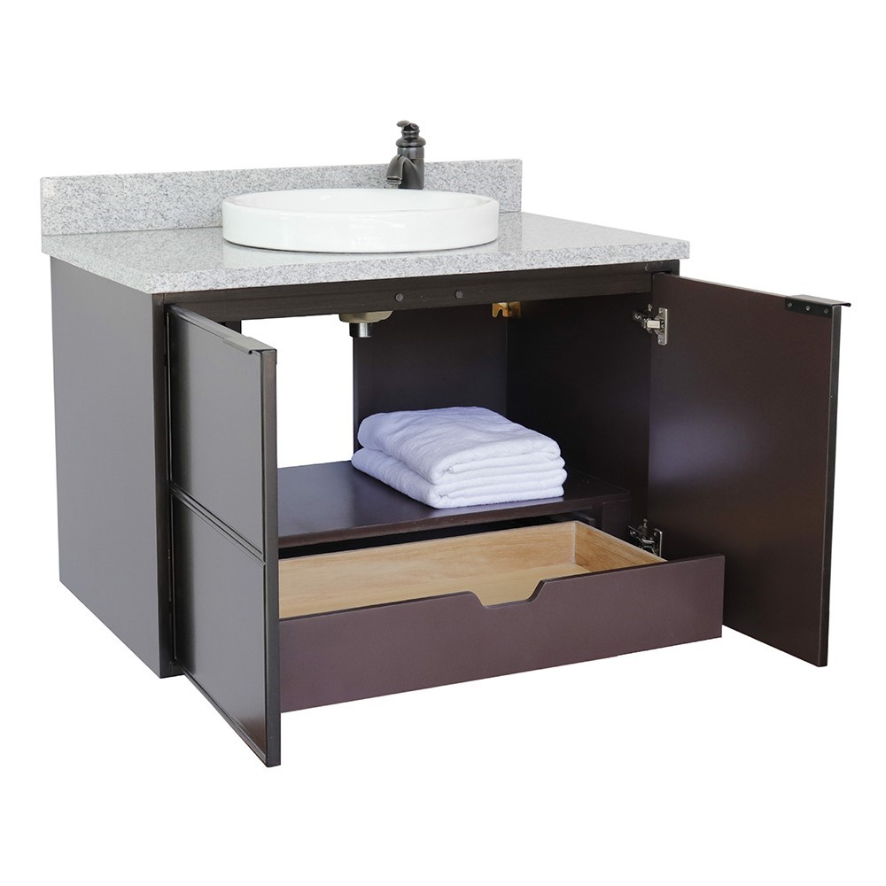Wood and veneer over plywood construction, no MDF or particle boardEach cabinet is configured to work with our variety of countertops or any standard sized topsFull corner block on all corners for stabilityInterior finish matches the exteriorInterior drawer is constructed with English dovetail and smooth full extension glideSoft close hingesBig cutout in the back for easy plumbing installationSolid door handle in wrought iron finishCabinet is fully assembled Mounting hardware includedGenuine Gray GranitecUPC certified white ceramic sink factory pre-installed, no assembly required1.3 in. (33mm) thickness eased-edge elegant lookVanity top is pre-drilled with one faucet hole for a single hole faucet (faucet not included)
