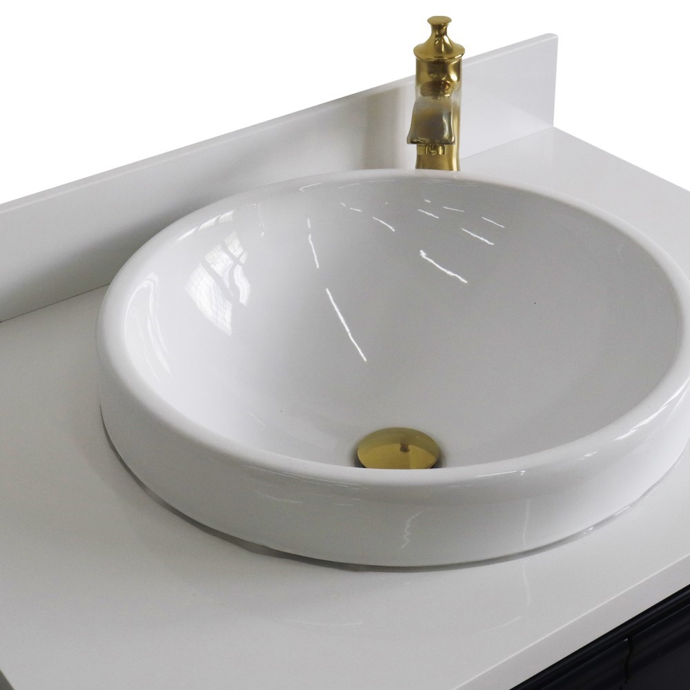 The Forli collection by Bellaterra Home features stunning bathroom vanities that can seamlessly integrate with any home design. The classic simplicity and elegance of this beautifully crafted piece of furniture will be the highly appreciated focal point in your bathroom. The cabinet doors open to a large storage space and an interior drawer that can be configured to fit any personal needs. The hidden drawer is constructed with English dovetail and includes built in wood drawer dividers for easy and functional organization. The drawer is installed with smooth full extension glides which provide durability. This vanity features gold finish hardware and a beautiful counter top that is pre-sealed and polished for added protection. The bathroom vanity top is preinstalled with a white cUPC certified ceramic sink.
