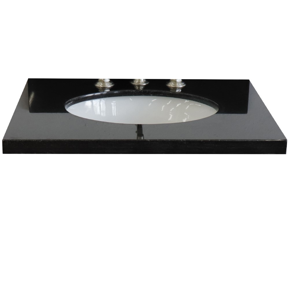 Add a luxurious touch to your space with this Bellaterra Home bathroom vanity top. It features a 1.2in. thick black Galaxy preinstalled with a white Undermount cUPC certified oval grade A ceramic sink. A lovely blend of black and gold specs pattern are the distinctive appearance of black Galaxy This brings sophisticated style to the room. This sink top is ideal for various installs. This is the perfect solution for quick and easy remodels as it comes in fully assembled with the sink. Variations in color, pattern, size, shape and shade are inherent and unique characteristics of a natural material and it is to be expected with this product. Performance of the material is not affected by these variations. All stone and ceramic surfaces can be damaged by force or by sudden and/or rapid change of temperature. Bellaterra Homes counter tops are pre-sealed and polished for added protection during manufacturing. However it is not permanent. Re-sealing the top before using is required to ensure proper protection.