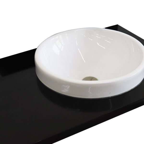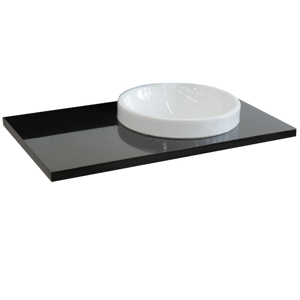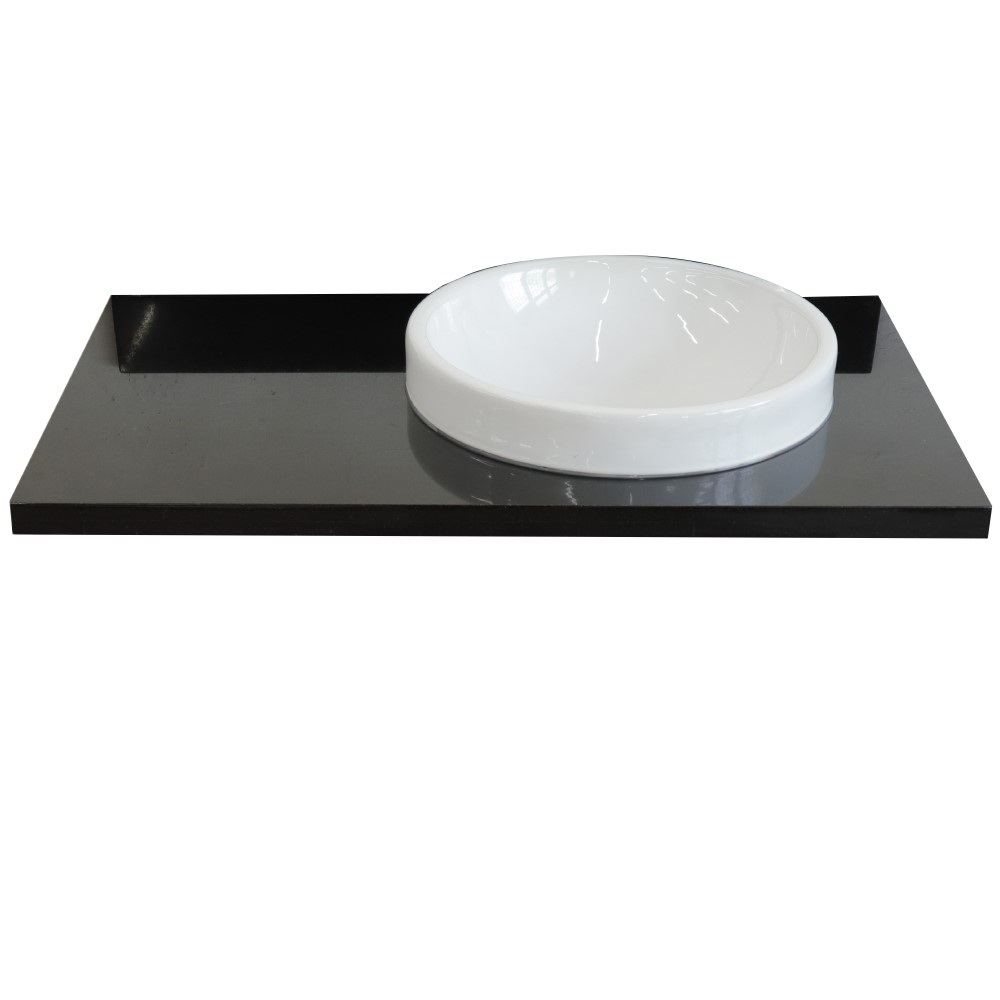 Add a luxurious touch to your space with this Bellaterra Home bathroom vanity top. It features a 1.2in. thick black Galaxy preinstalled with a white Semi-recessed cUPC certified Round grade A ceramic sink. A lovely blend of black and gold specs pattern are the distinctive appearance of black Galaxy. This brings sophisticated style to the room. This sink top is ideal for various installs. This is the perfect solution for quick and easy remodels as it comes in fully assembled with the sink. Variations in color, pattern, size, shape and shade are inherent and unique characteristics of a natural material and it is to be expected with this product. Performance of the material is not affected by these variations. All stone and ceramic surfaces can be damaged by force or by sudden and/or rapid change of temperature. Bellaterra Homes counter tops are pre-sealed and polished for added protection during manufacturing. However it is not permanent. Re-sealing the top before using is required to ensure proper protection.