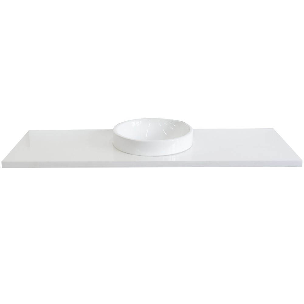 Add a luxurious touch to your space with this Bellaterra Home bathroom vanity top. It features a 1.2in. thick Engineered Stone preinstalled with a white Semi-recessed cUPC certified Round grade A ceramic sink. A lovely blend of white and off white pattern are the distinctive appearance of Engineered Stone. This brings sophisticated style to the room. This sink top is ideal for various installs. This is the perfect solution for quick and easy remodels as it comes in fully assembled with the sink. Variations in color, pattern, size, shape and shade are inherent and unique characteristics of a natural material and it is to be expected with this product. Performance of the material is not affected by these variations. All stone and ceramic surfaces can be damaged by force or by sudden and/or rapid change of temperature. Bellaterra Homes counter tops are pre-sealed and polished for added protection during manufacturing. However it is not permanent. Re-sealing the top before using is required to ensure proper protection.