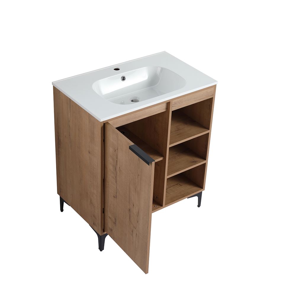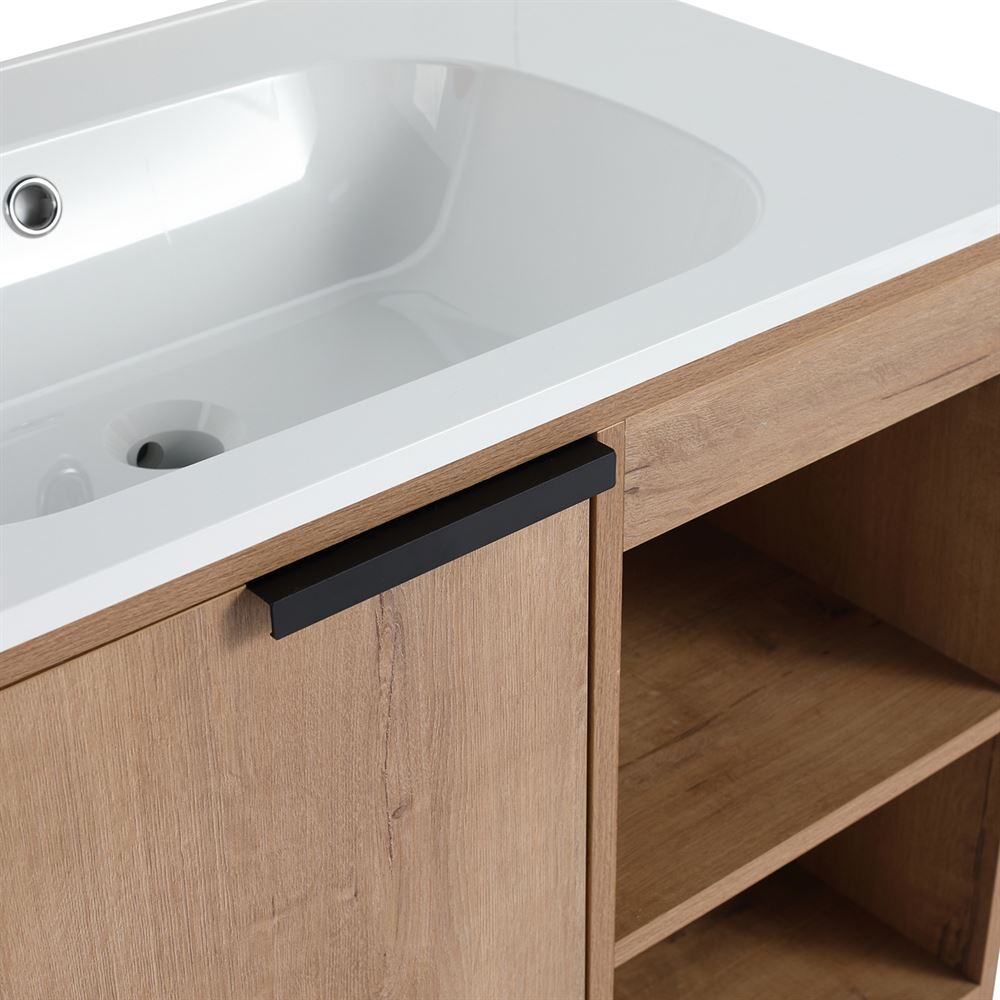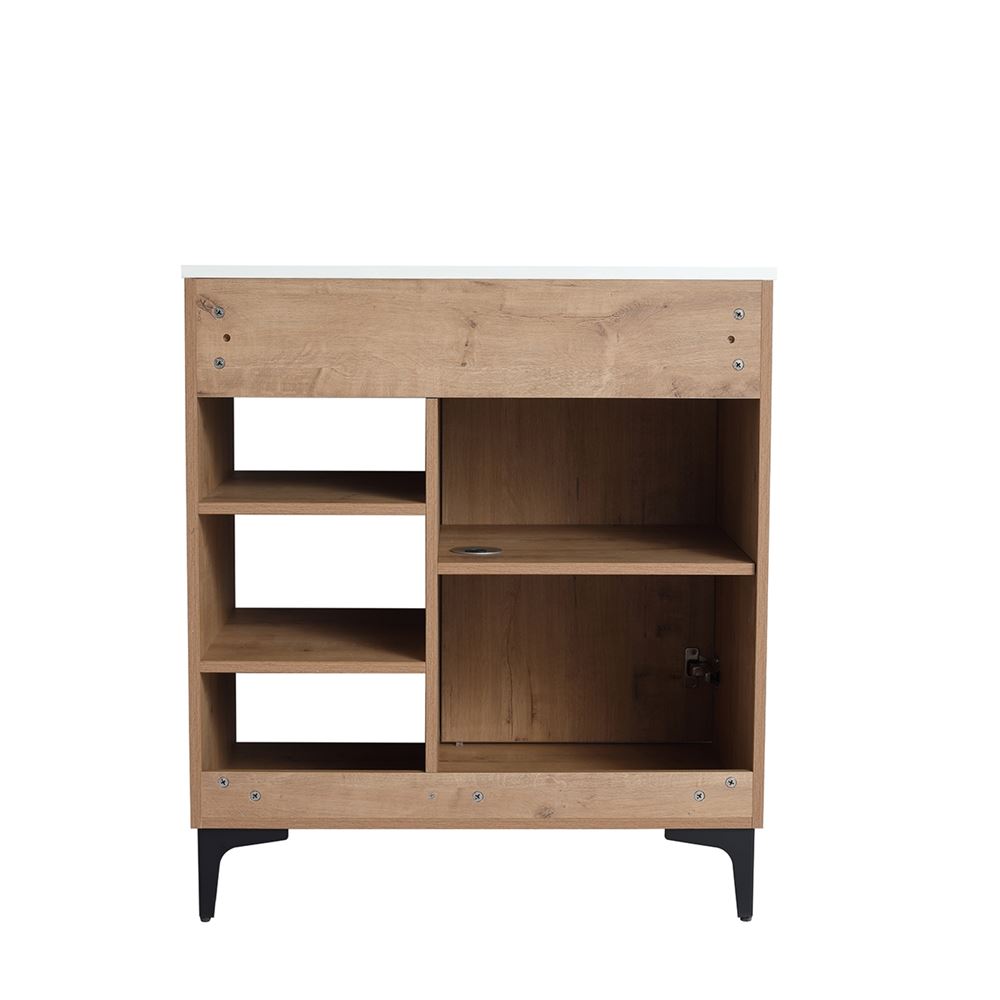 Transform your bathroom with our 30" Single Sink Vanity in a chic Neutral finish, constructed with scratch and moisture resistant Melamine coated Plywood, featuring a solid surface resin sink. Enjoy the elegance of the clean lined door with a soft-close hinge and sleek Matte Black edge pull for luxurious functionality. Our sturdy decorative collapsible baskets and adjustable shelves offer an adaptable storage solution and generous space for your essentials. Engineered with Sheet Moulding Compounds, our sink is resistant to extreme temperatures and corrosion, making it perfect for any environment. Our "flat pack" vanity is delivered in flat packaging and clear instructions streamlining a quick and easy assembly. Plumbing installation is hassle-free with the shelf hole cutout and open back design. Faucet and drain not included.