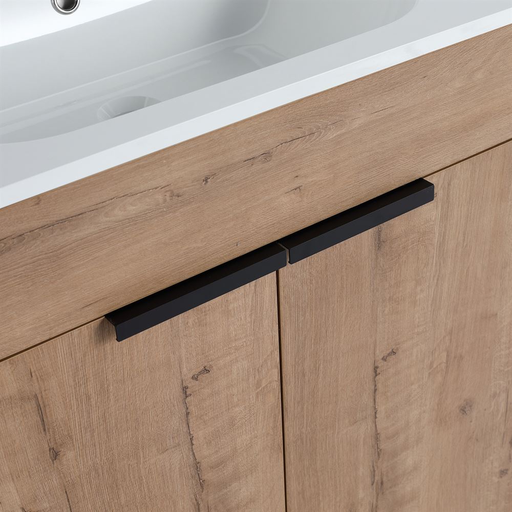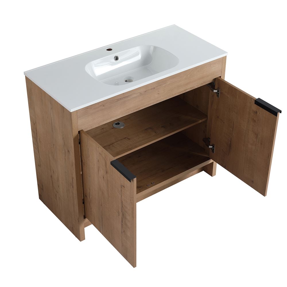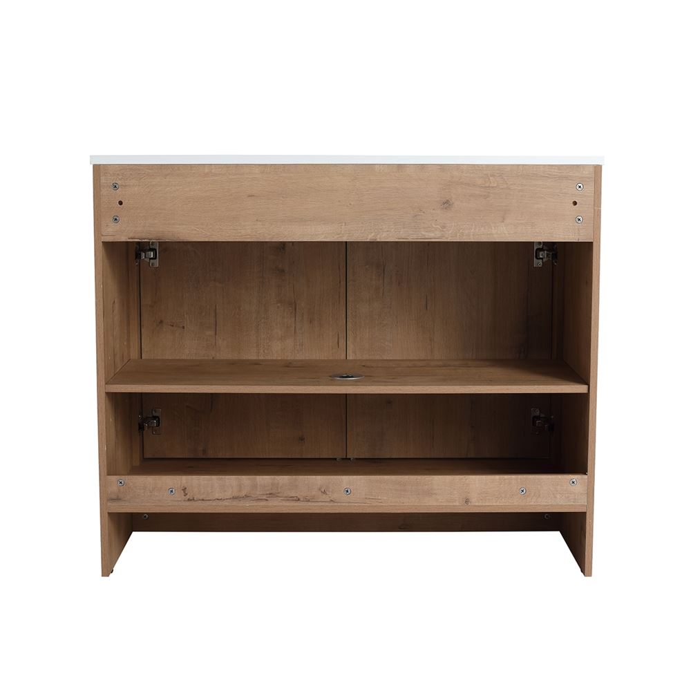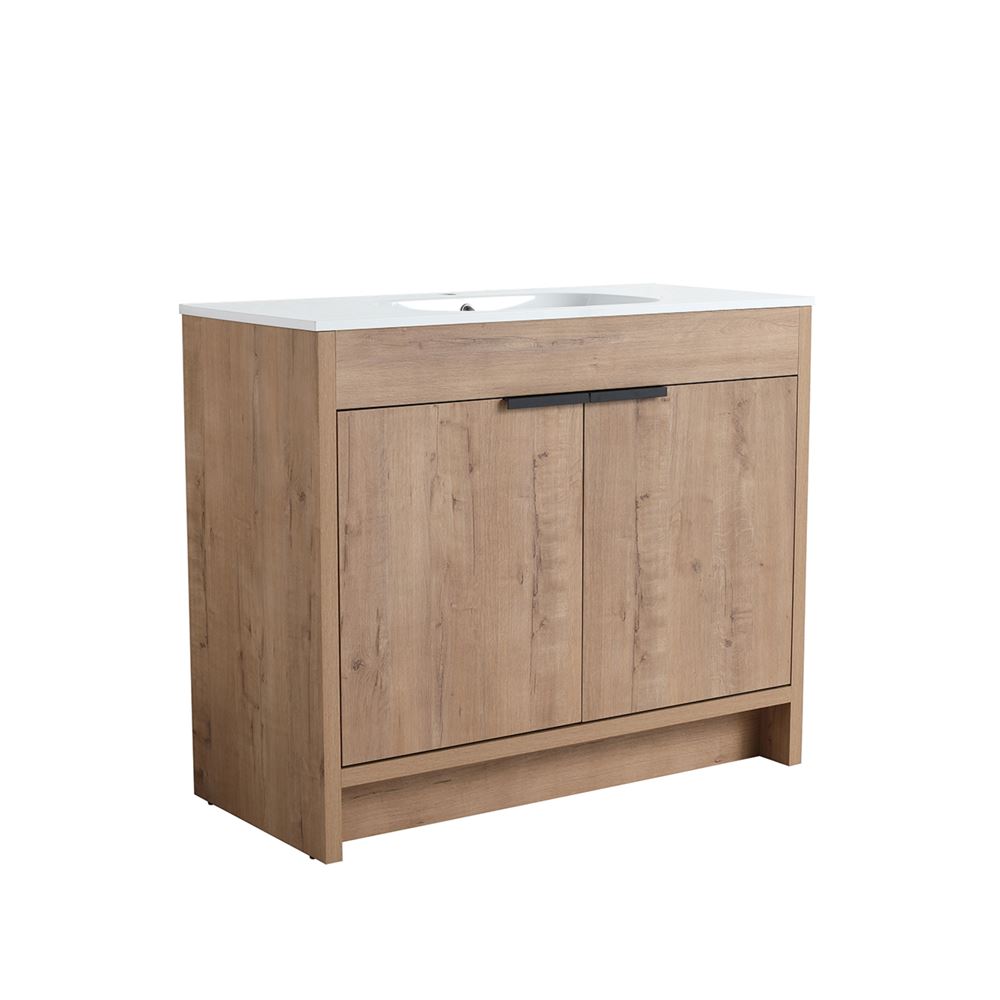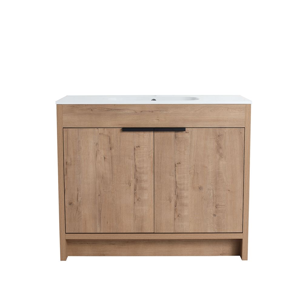 Discover our 40" Single Sink Vanity, a flawless fusion of contemporary style and innovative engineering. Its Melamine coated Plywood construction in a Neutral finish ensures resistance to scratches and moisture. The solid surface resin sink resists heat, corrosion, and damage maintaining its beauty. The clean lined doors deliver a luxurious experience with soft-close hinges and sleek Matte Black edge pulls. Optimize the interior storage compartments with the adjustable shelf. The shelf outlet hole cutout and open back design simplifies drainpipe installation.