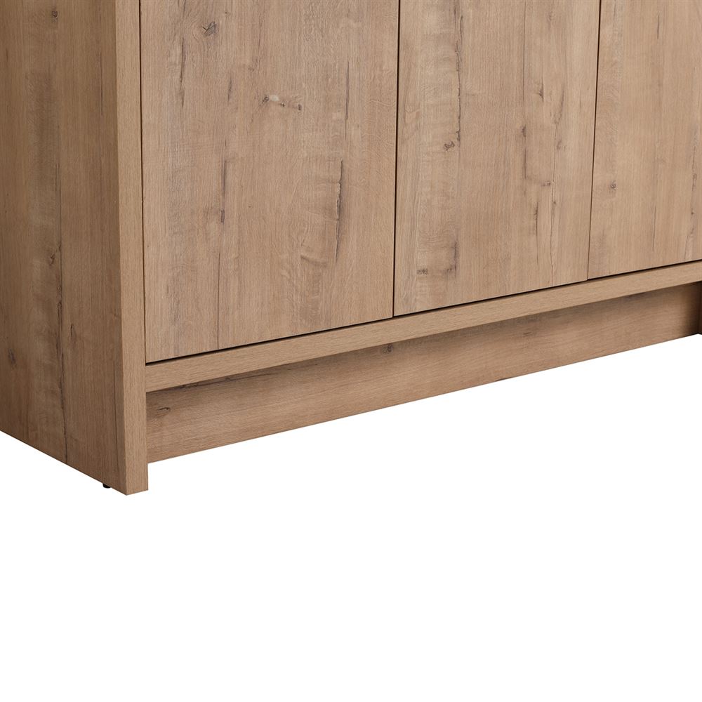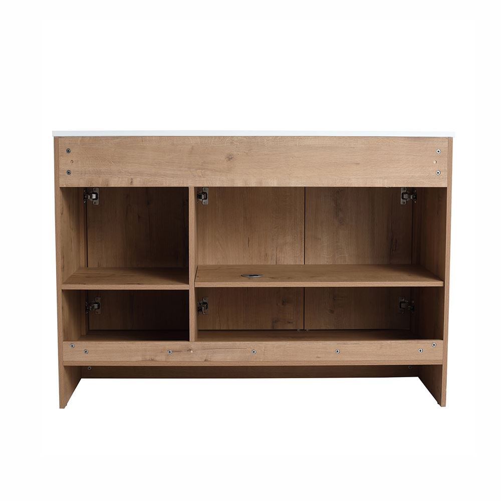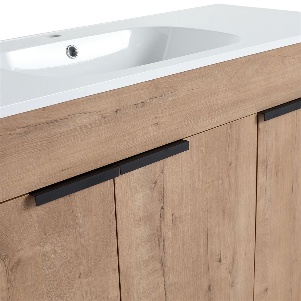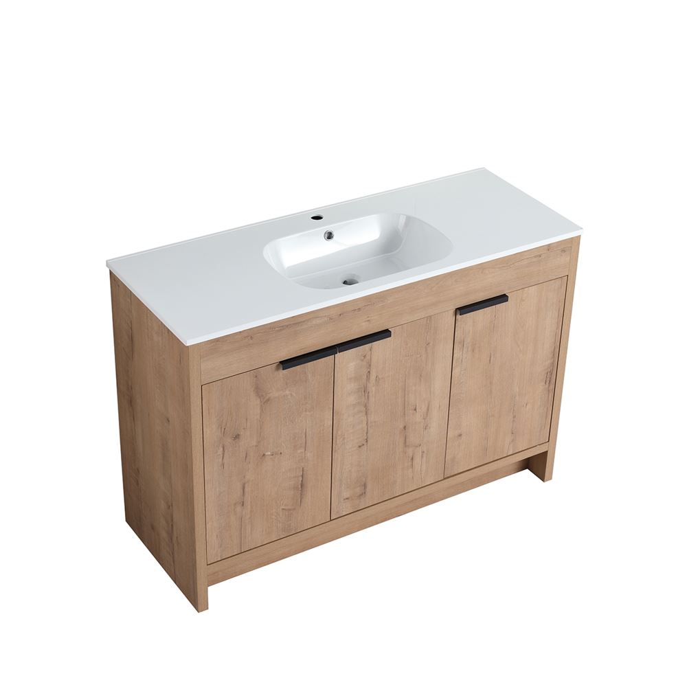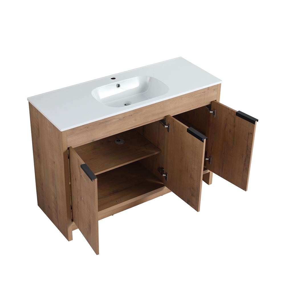 Discover our 48" Single Sink Vanity, a flawless fusion of contemporary style and innovative engineering. Its Melamine coated Plywood construction in a Neutral finish ensures resistance to scratches and moisture. The solid surface resin sink resists heat, corrosion, and damage maintaining its beauty. The clean lined doors deliver a luxurious experience with soft-close hinges and sleek Matte Black edge pulls. Optimize the interior storage compartments with the adjustable shelves. The shelf outlet hole cutout and open back design simplifies drainpipe installation.