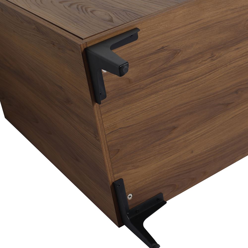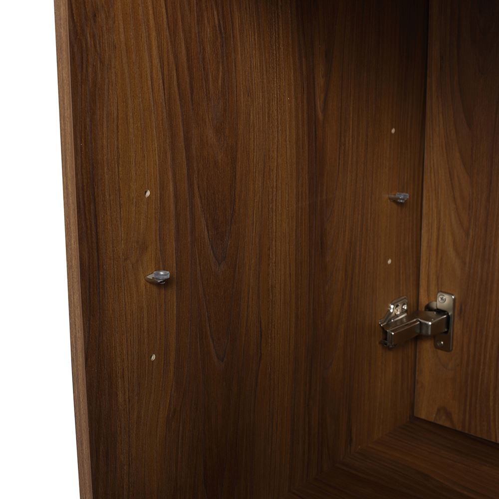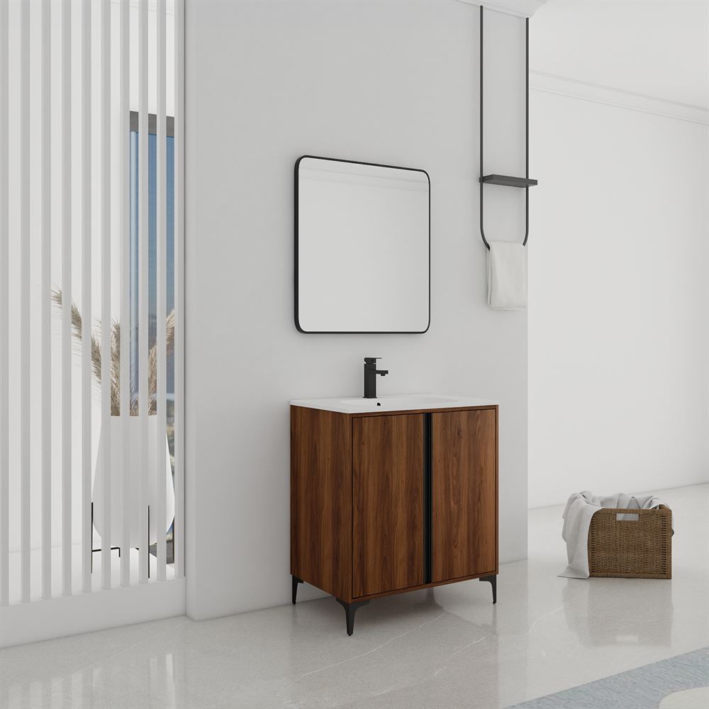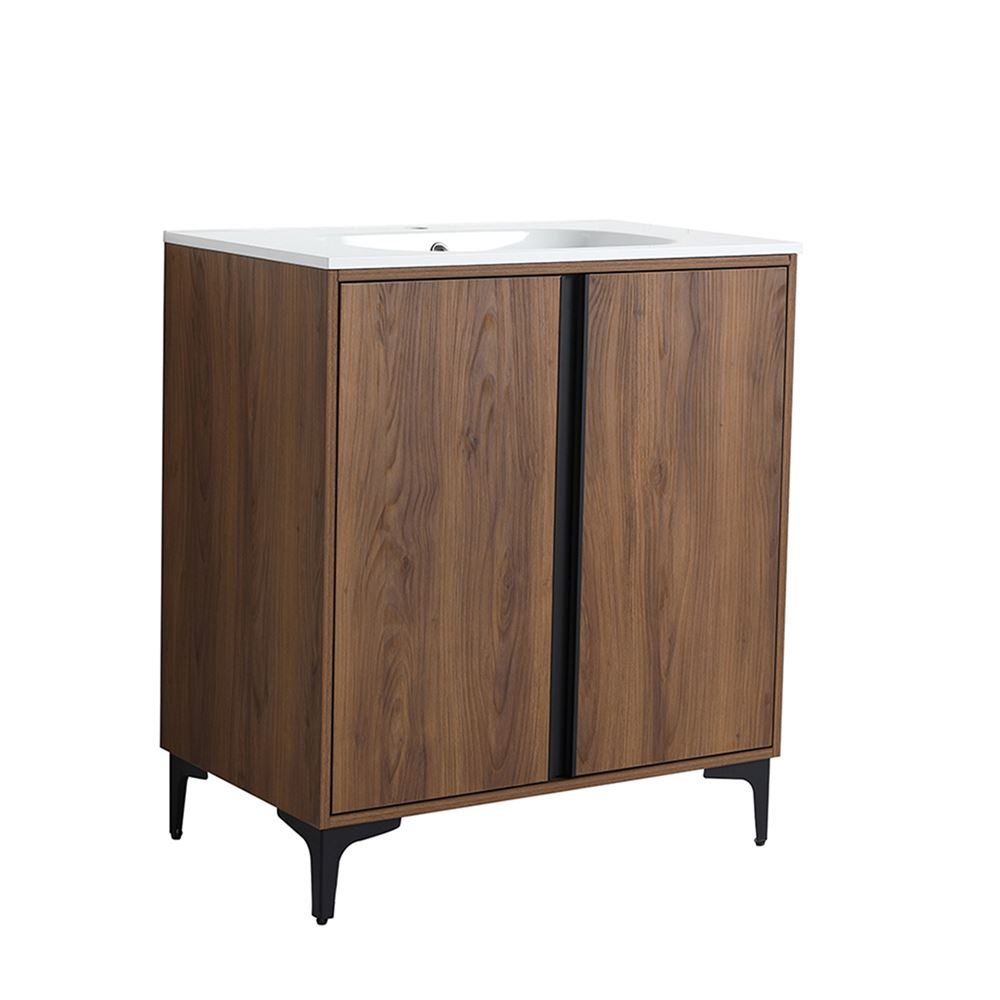 Our 30” Single Sink Vanity in Brown Walnut Wood finish effortlessly combines contemporary design with premium features. The clean lined doors complemented with soft-close hinges and fully vertical Matte Black edge pulls offer a serene experience. Available in four sizes, crafted with innovative Melamine coated Plywood and featuring a Solid Surface Resin sink, this vanity is perfect for any space. Tailor your storage with the adjustable shelf. The shelf outlet hole cutout and open back design eases drainpipe installation.
