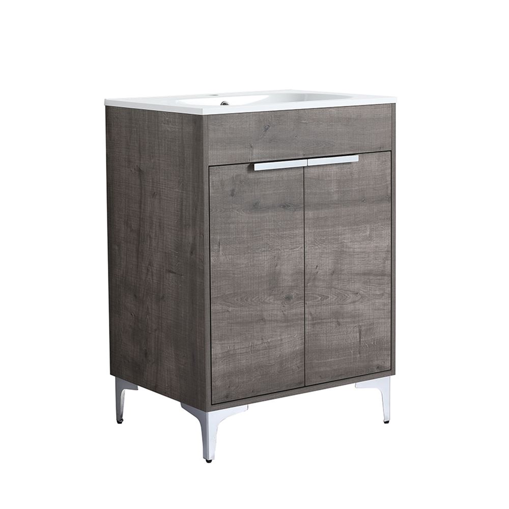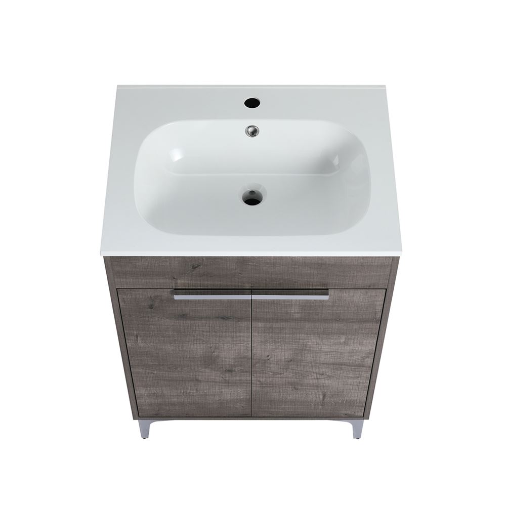Transform your bathroom into a modern retreat with our 24” Single Sink Vanity in a textured Gray Oak finish, featuring a solid surface resin counter-top sink and Brushed Nickel edge pulls. The countertop-sink is engineered with sheet molding materials showcasing a seamless connection to ease cleaning and resist extreme temperatures and corrosion. The cabinet is crafted from Melamine coated Plywood to resist scratches and maintain its durable integrity.