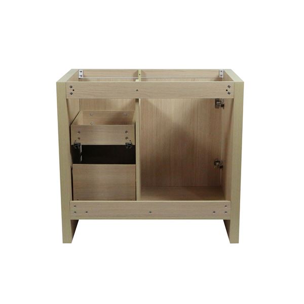 This 36 inch single sink transitional vanity has a beautiful, clean design that will rejuvenate any bathroom. It is constructed from high quality Melamine coated engineered wood, finished in a neutural wood color. Melamine is high scratch-resistant properties. It also does not stain easily. And to top it all, it is easy to clean. Melamine board provides a highly-level surface, which makes it an excellent material for making bathroom cabinets. This vanity base equipped with state of the art, soft closing drawer technology. The vanity features an integrated ceramic basin resting above the main cabinet. It has two full size drawers and 1 door, all preinstalled with satin nickel hardware, you"ll have abundant storage space & plumbing configuration space at the back of the cabinet. This is one of the best compliments you can provide to your living spaces. Faucet is not included; matching backsplash and mirror are available for separate purchase.