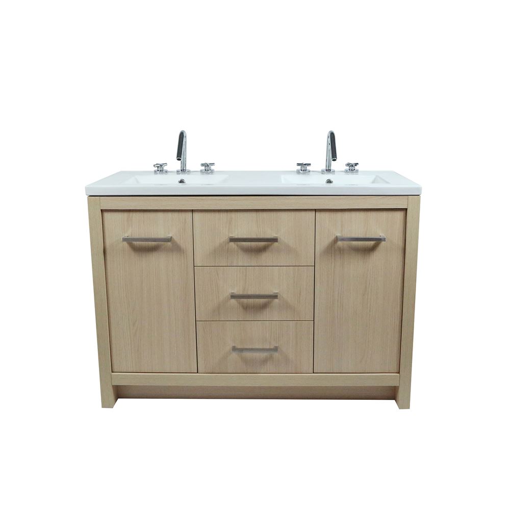 This 48 inch double sink transitional vanity has a beautiful, clean design that will rejuvenate any bathroom. It is constructed from high quality Melamine coated engineered wood, finished in a neutural wood color. Melamine is high scratch-resistant properties. It also does not stain easily. And to top it all, it is easy to clean. Melamine board provides a highly-level surface, which makes it an excellent material for making bathroom cabinets. This vanity base equipped with state of the art, soft closing drawer technology. The vanity features an integrated ceramic basin resting above the main cabinet. It has three full size drawers and two doors, all preinstalled with satin nickel hardware, you"ll have abundant storage space & plumbing configuration space at the back of the cabinet. This is one of the best compliments you can showcase your decor styles. Faucet is not included; matching backsplash and mirror are available for separate purchase.