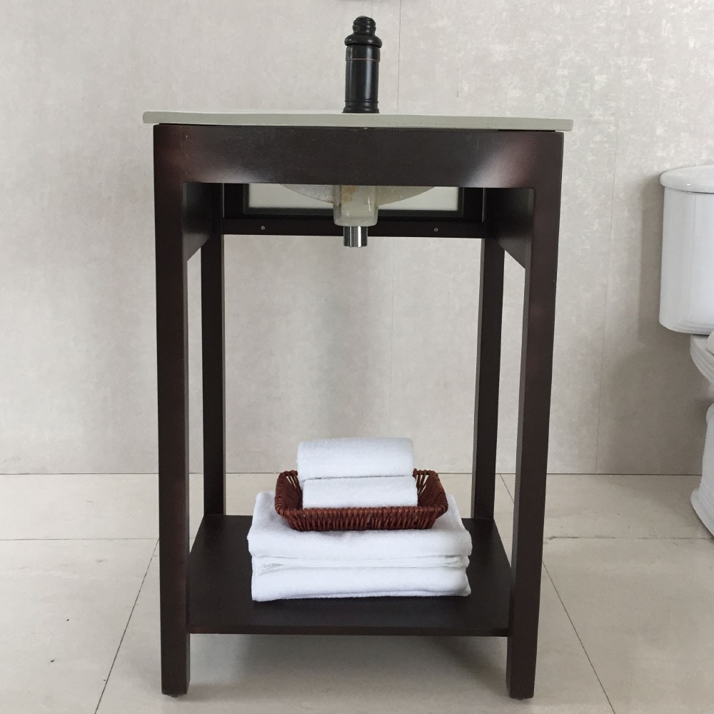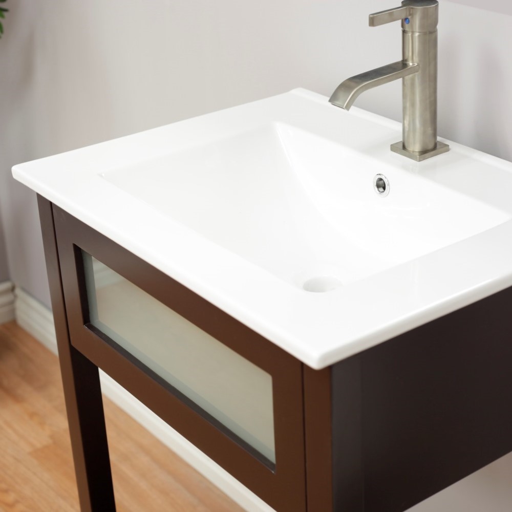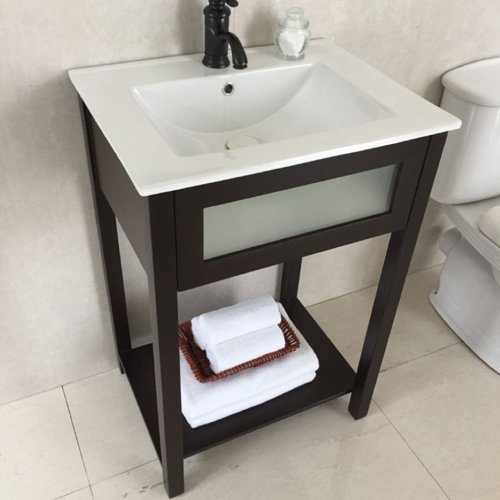 This contemporary single sink vanity is the perfect fit for a powder room or small bathroom! This clean and sleek design is in a beautiful espresso color and offers an open shelf for storage