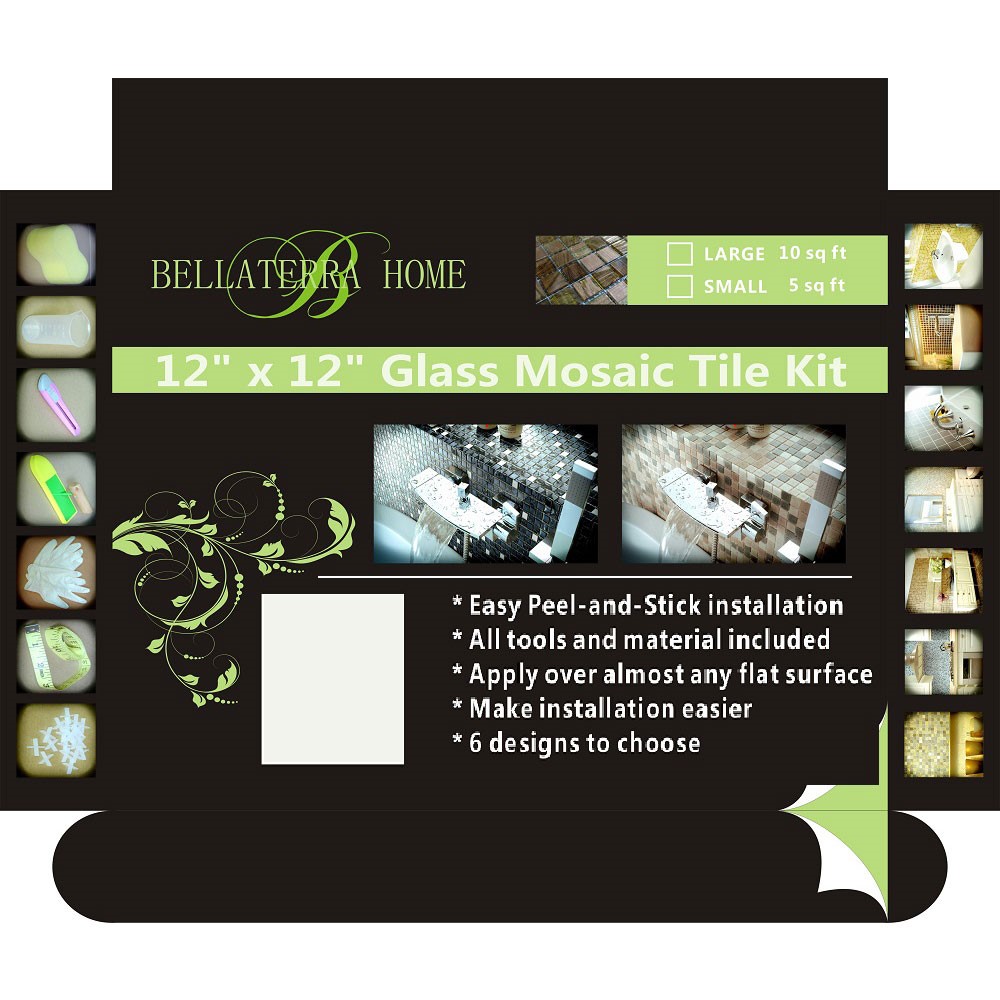 Give your walls a bejeweled appearance with Bellaterra Home Glass Tiles DIY Kit. These 12 in. x 12 in. mesh-mounted wall tiles boast a mesmerizing mixture of multi-color glass tiles to beautifully enhance kitchens, bathrooms, furniture, fireplace mantels and more. The application is simply endless. These high quality glass tiles have the easy to install 3M peel-and-stick technology. The strong adhesion will adhere to all clean surfaces no matter in residential and commercial settings. They perform splendidly as countertops and backsplashes, or use in smaller amounts as accent tiling to any of your decor in the house. Each kit contains 10 sheets of 12in. x 12in. glass mosaic tiles to cover approximately 10 sqft. It includes: 10 sheets of peel-and-stick glass mosaic tiles, grout mix, grout float, gloves, utility blade, tape measure and sponge-all the tools youin.ll need to complete the job. No prior experience or a contractor is needed. All you need is your creativity.