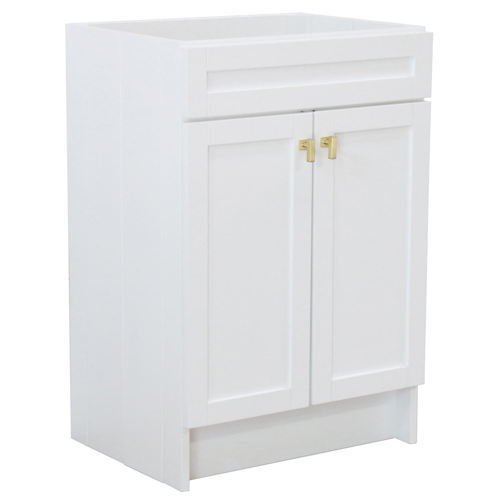 Elevate any modern living space with this 23 in. foldable freestanding vanity. Crafted from a premium blend of solid wood and plywood in a white wood finish, this vanity boasts exceptional durability and timeless beauty. Its compact dimensions and lightweight construction allow for hassle-free and toolless assembly. The opened back design ensures straightforward plumbing installation. Embrace convenience with shaker style soft closing doors, offering a seamless and noiseless experience. This versatile vanity also features an adjustable interior shelf providing 3 different storage options for your essentials. This cabinet is available in 3 different beautiful hardware finish options: matte black, brushed nickel, and brushed gold.