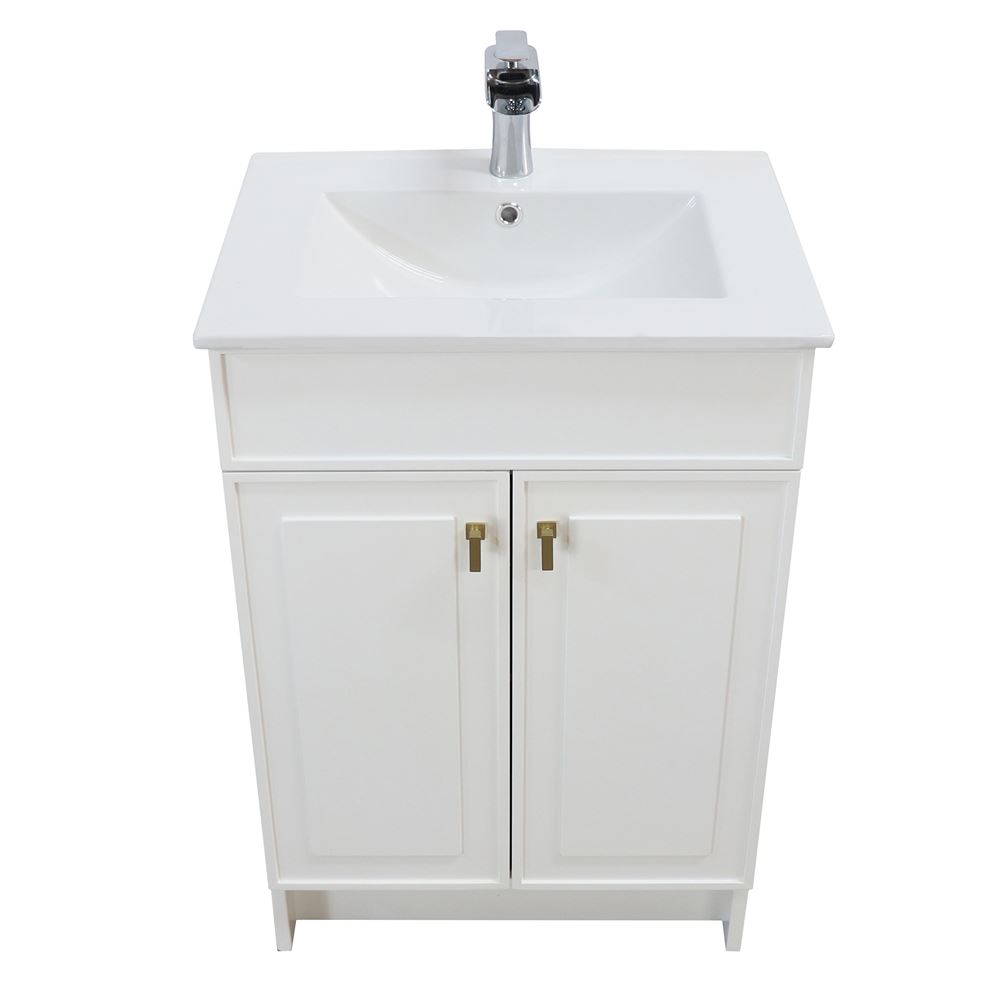Experience true convenience; transform your modern living space with the elegance of a 23 in. foldable freestanding vanity with single vanity top. Meticulously crafted from a premium blend of solid wood and plywood, this vanity radiates timeless beauty while ensuring exceptional durability. Its ingenious design allows for effortless, tool-less assembly, thanks to its compact dimensions and lightweight build. With an open-back design, plumbing installation becomes a breeze. This vanity offers an easy to install ceramic top and adjustable shelf. Choose from three stunning hardware finish options: matte black, brushed nickel, or brushed gold, to personalize your perfect aesthetic. Elevate your space with this versatile and chic vanity.