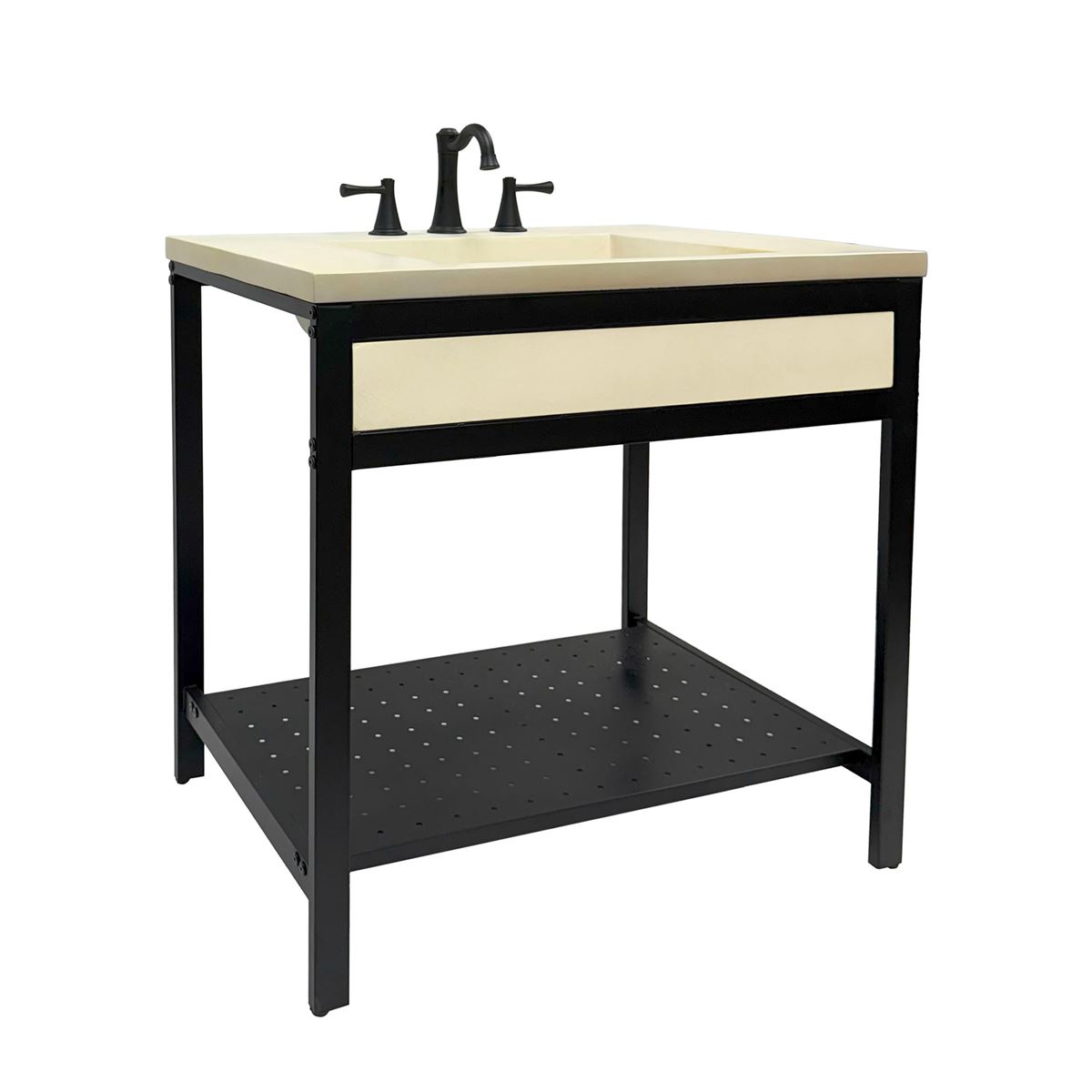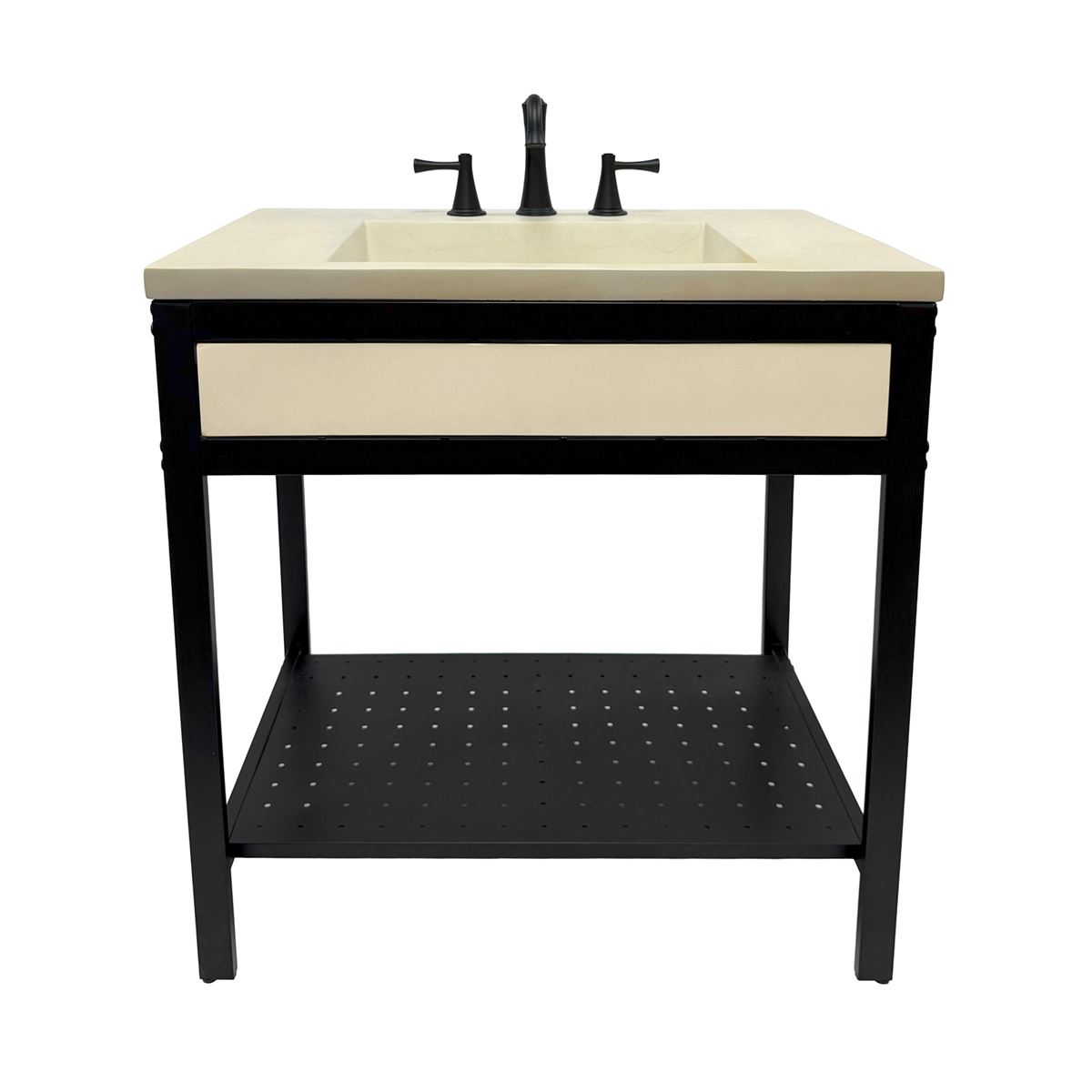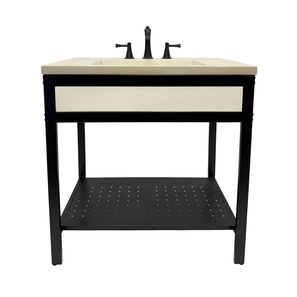 Elevate your space with this metal framed bathroom vanity featuring a sleek and unique concrete sinktop. The matte black metal frame provides a modern, industrial edge while ensuring durability and stability for daily use. With a large open bottom shelf for easy storage, this vanity combines practicality and style, keeping your bathroom organized and clutter-free. The matching concrete front piece complements the sinktop, which gives a visually cohesive look. This vanity is incredibly durable, easy to clean, and low-maintenance. Designed to enhance your space, this vanity seamlessly blends functionality with beauty, making it the perfect addition to any modern bathroom.