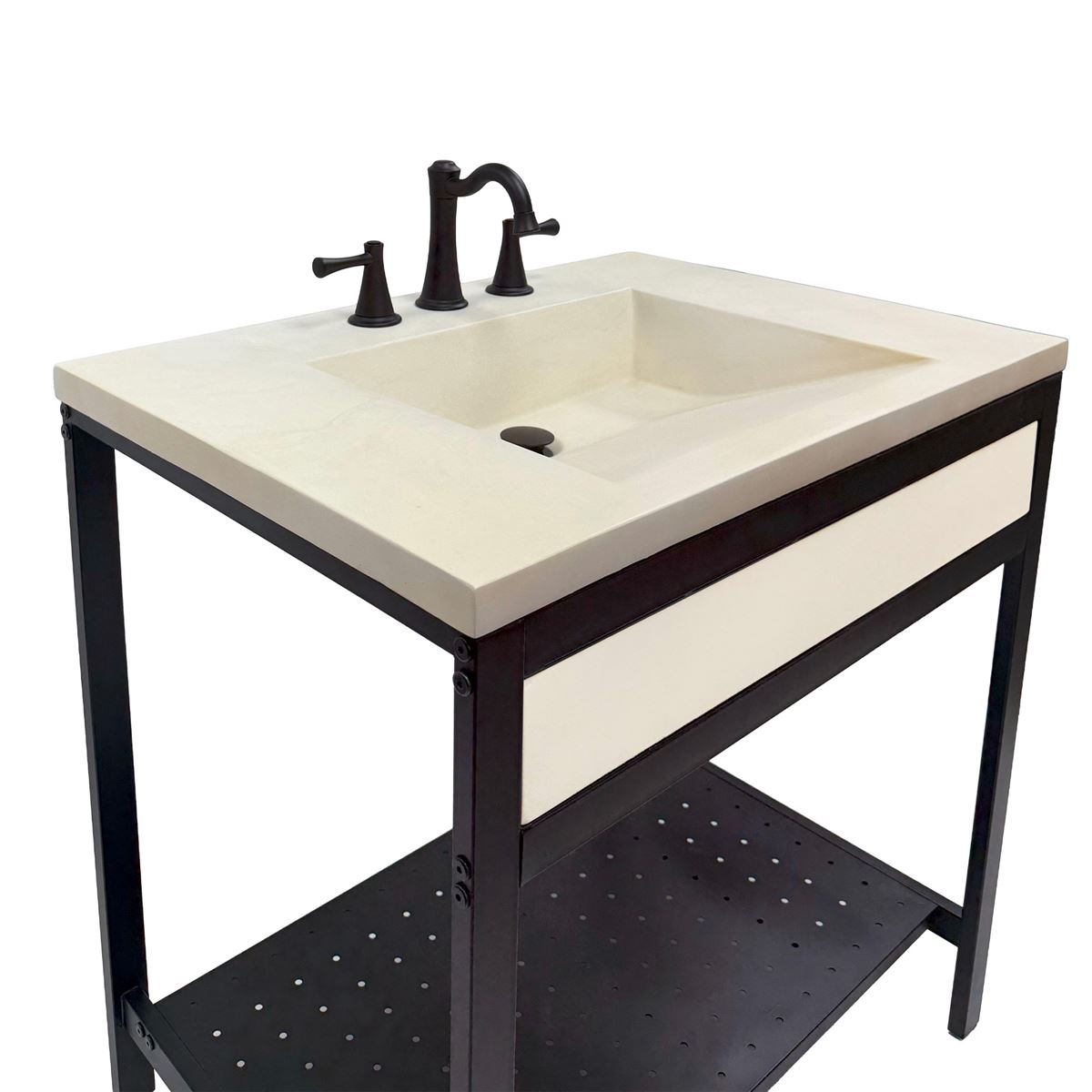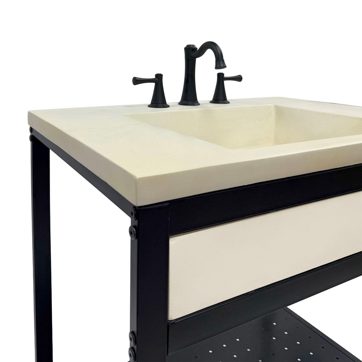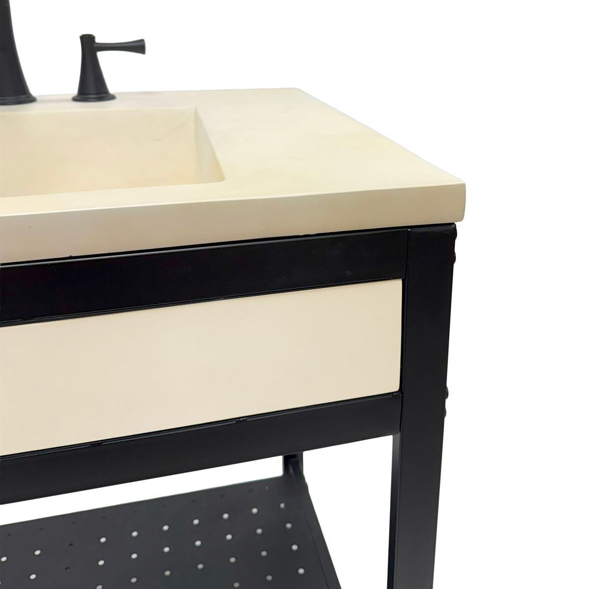 Elevate your space with this metal framed bathroom vanity featuring a sleek and unique concrete sinktop. The matte black metal frame provides a modern, industrial edge while ensuring durability and stability for daily use. With a large open bottom shelf for easy storage, this vanity combines practicality and style, keeping your bathroom organized and clutter-free. The matching concrete front piece complements the sinktop, which gives a visually cohesive look. This vanity is incredibly durable, easy to clean, and low-maintenance. Designed to enhance your space, this vanity seamlessly blends functionality with beauty, making it the perfect addition to any modern bathroom.