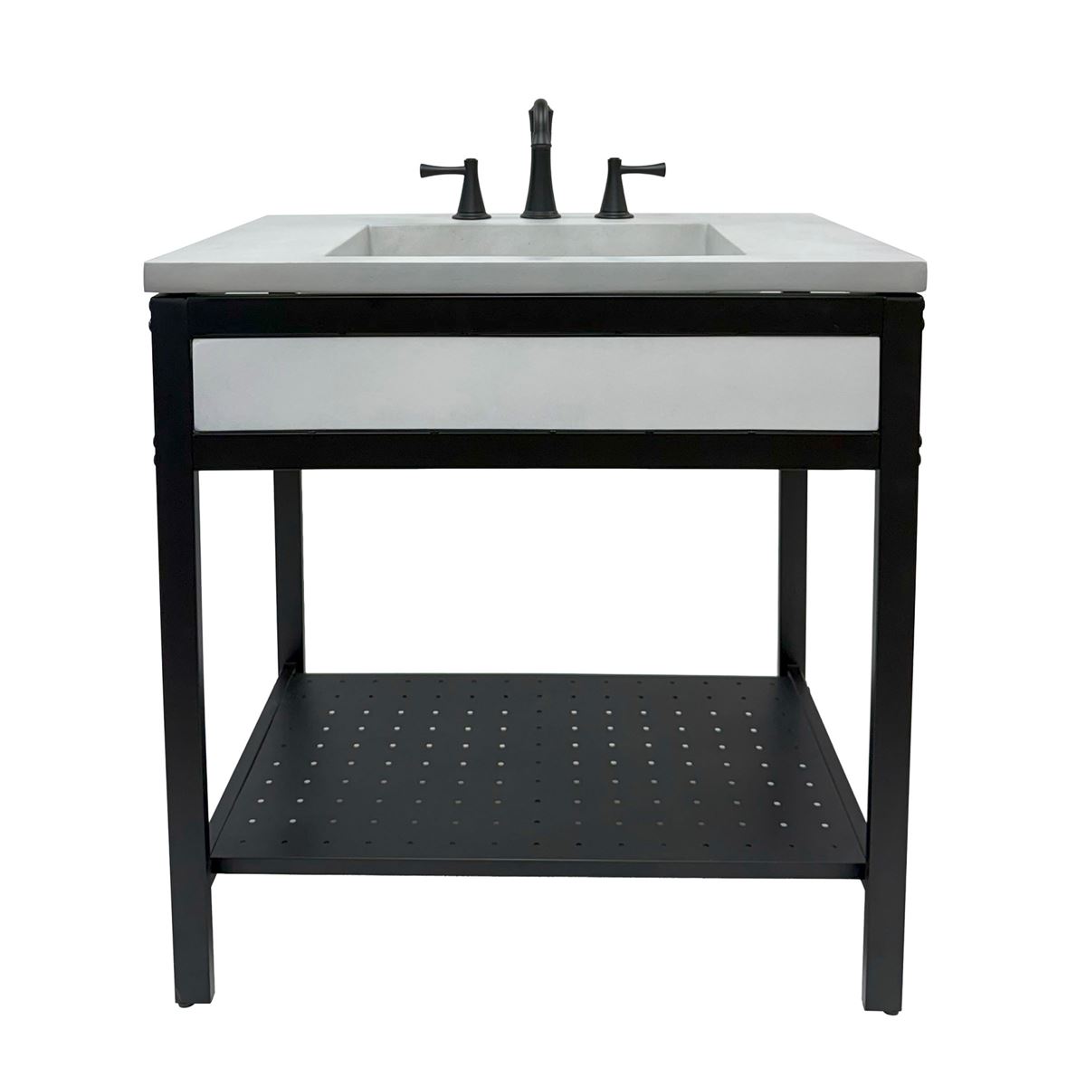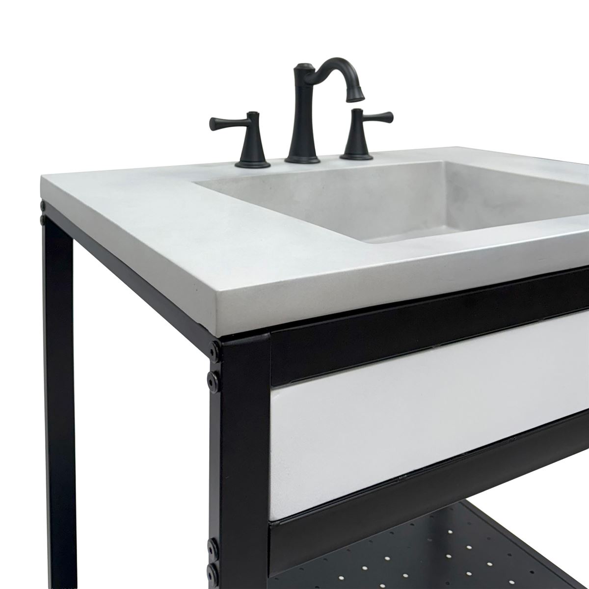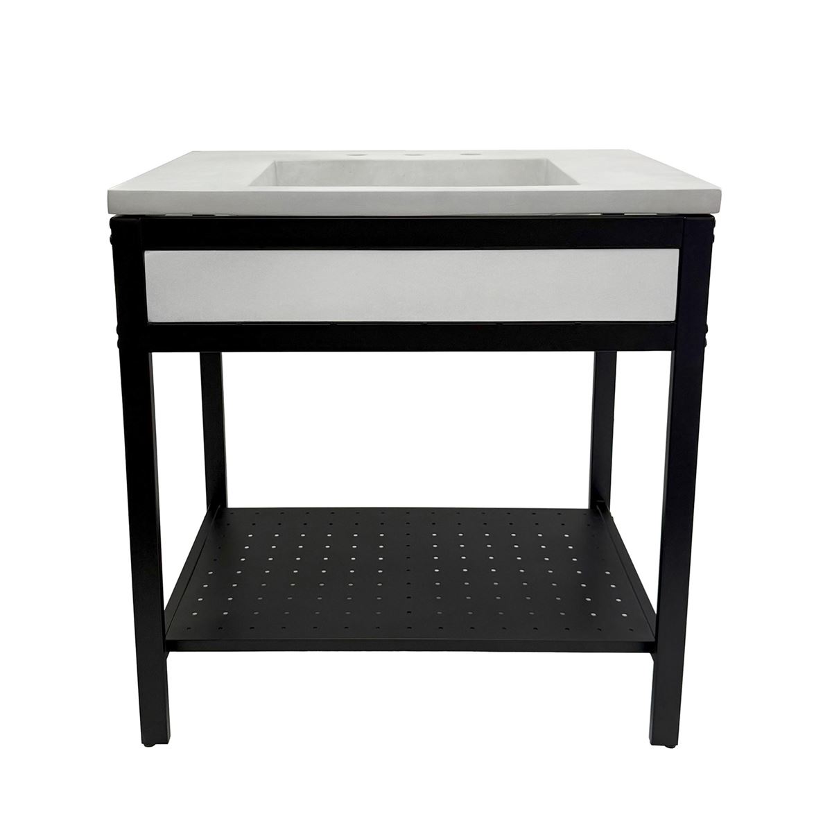 Elevate your space with this metal framed bathroom vanity featuring a sleek and unique concrete sinktop. The matte black metal frame provides a modern, industrial edge while ensuring durability and stability for daily use. With a large open bottom shelf for easy storage, this vanity combines practicality and style, keeping your bathroom organized and clutter-free. The matching concrete front piece complements the sinktop, which gives a visually cohesive look. This vanity is incredibly durable, easy to clean, and low-maintenance. Designed to enhance your space, this vanity seamlessly blends functionality with beauty, making it the perfect addition to any modern bathroom.