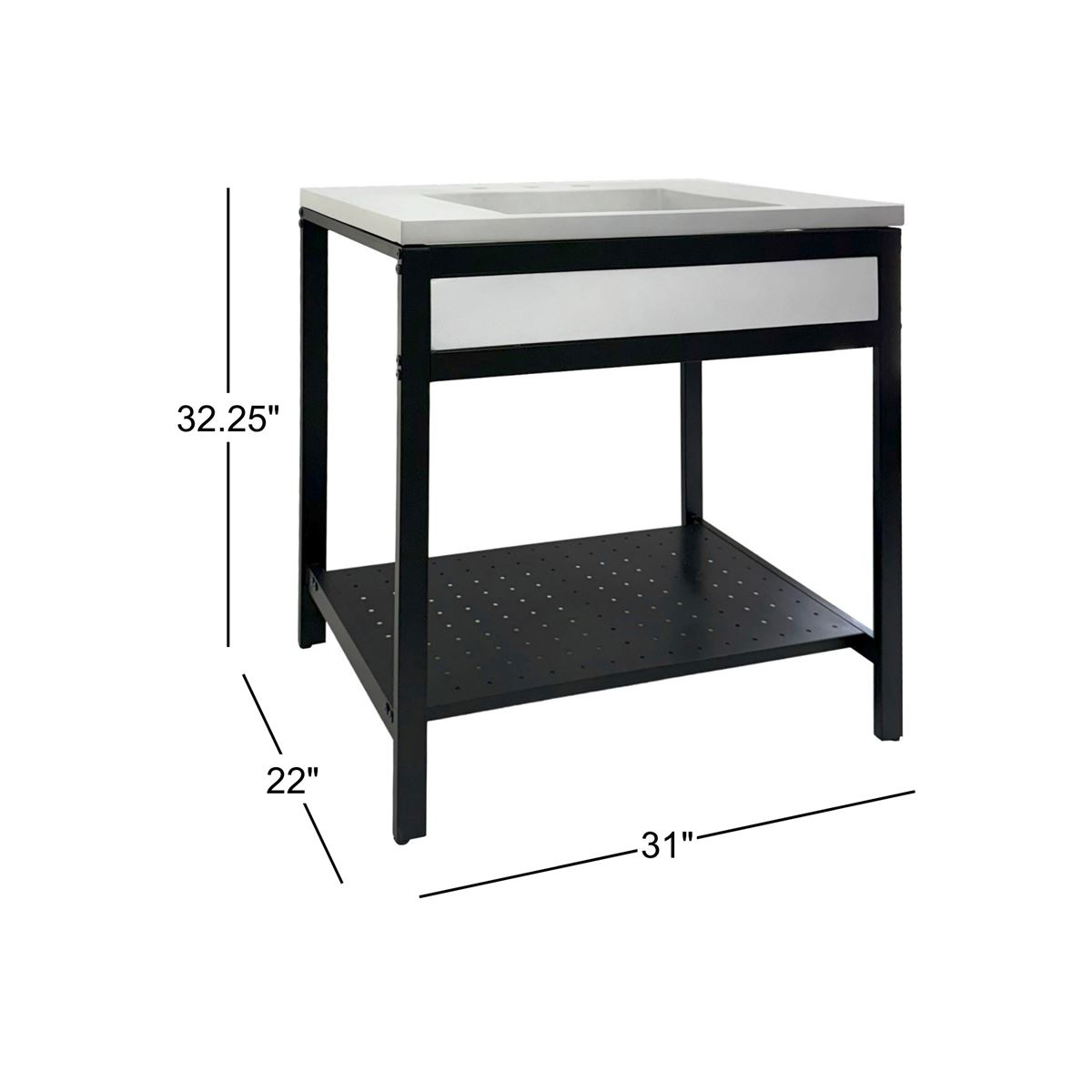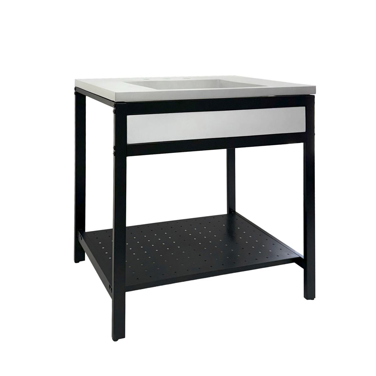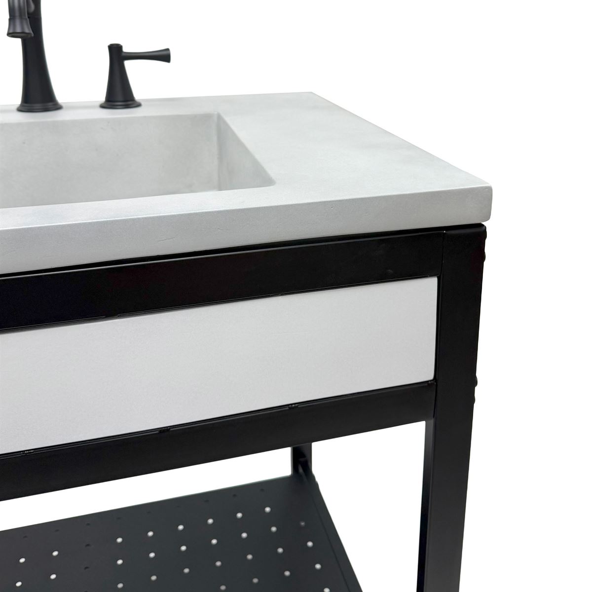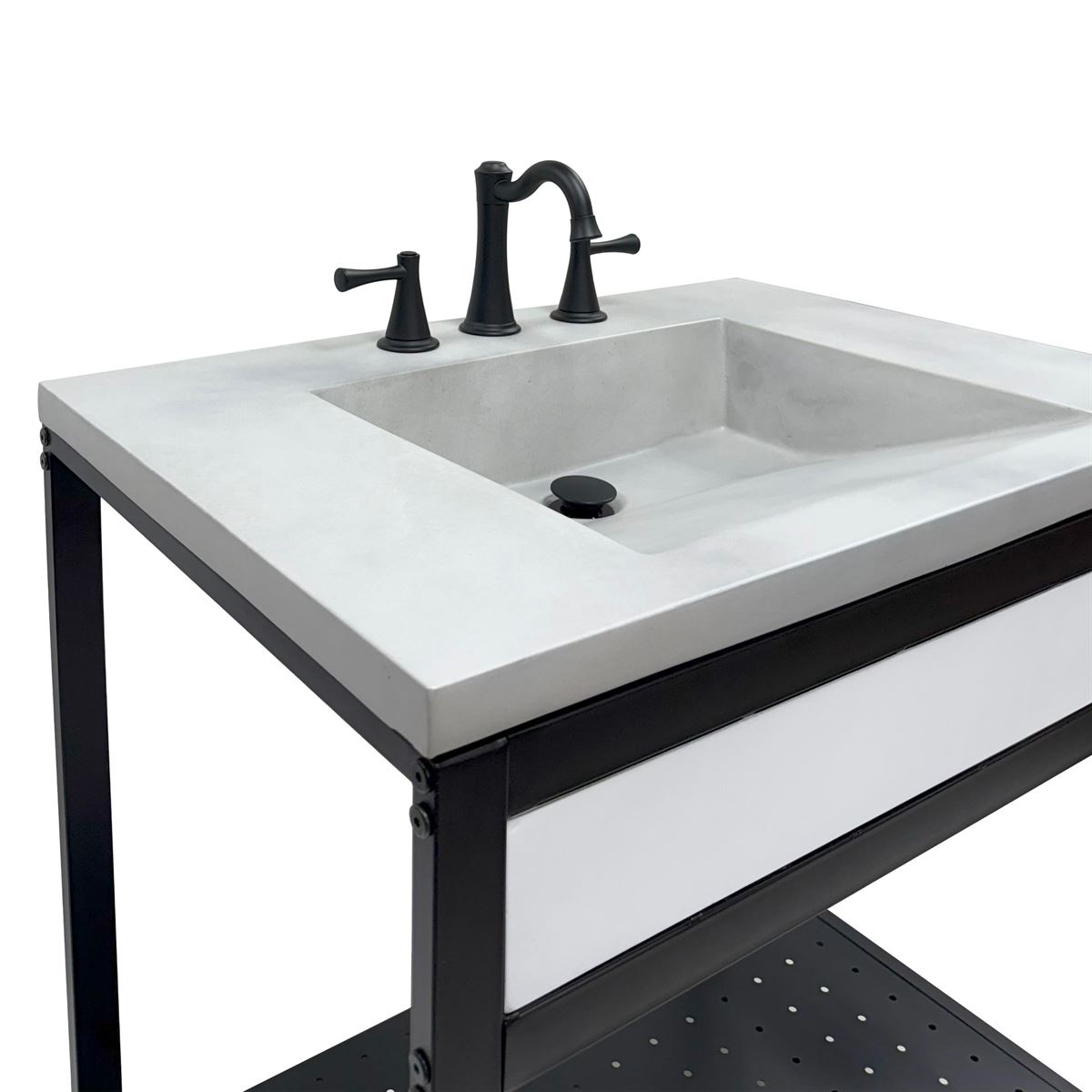 Elevate your space with this metal framed bathroom vanity featuring a sleek and unique concrete sinktop. The matte black metal frame provides a modern, industrial edge while ensuring durability and stability for daily use. With a large open bottom shelf for easy storage, this vanity combines practicality and style, keeping your bathroom organized and clutter-free. The matching concrete front piece complements the sinktop, which gives a visually cohesive look. This vanity is incredibly durable, easy to clean, and low-maintenance. Designed to enhance your space, this vanity seamlessly blends functionality with beauty, making it the perfect addition to any modern bathroom.