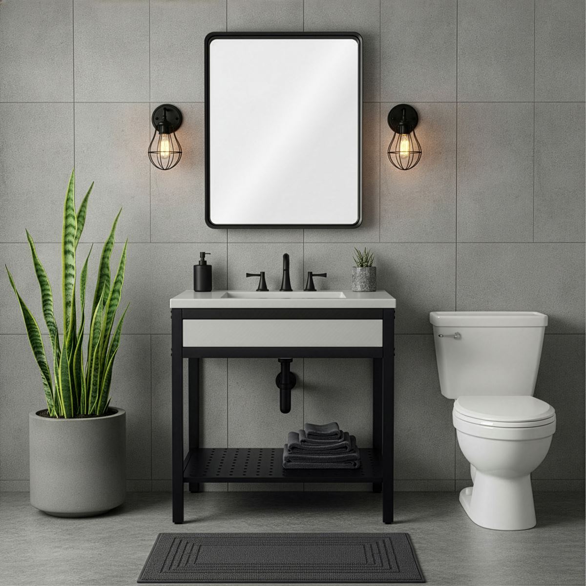 - Matte black metal framed vanity