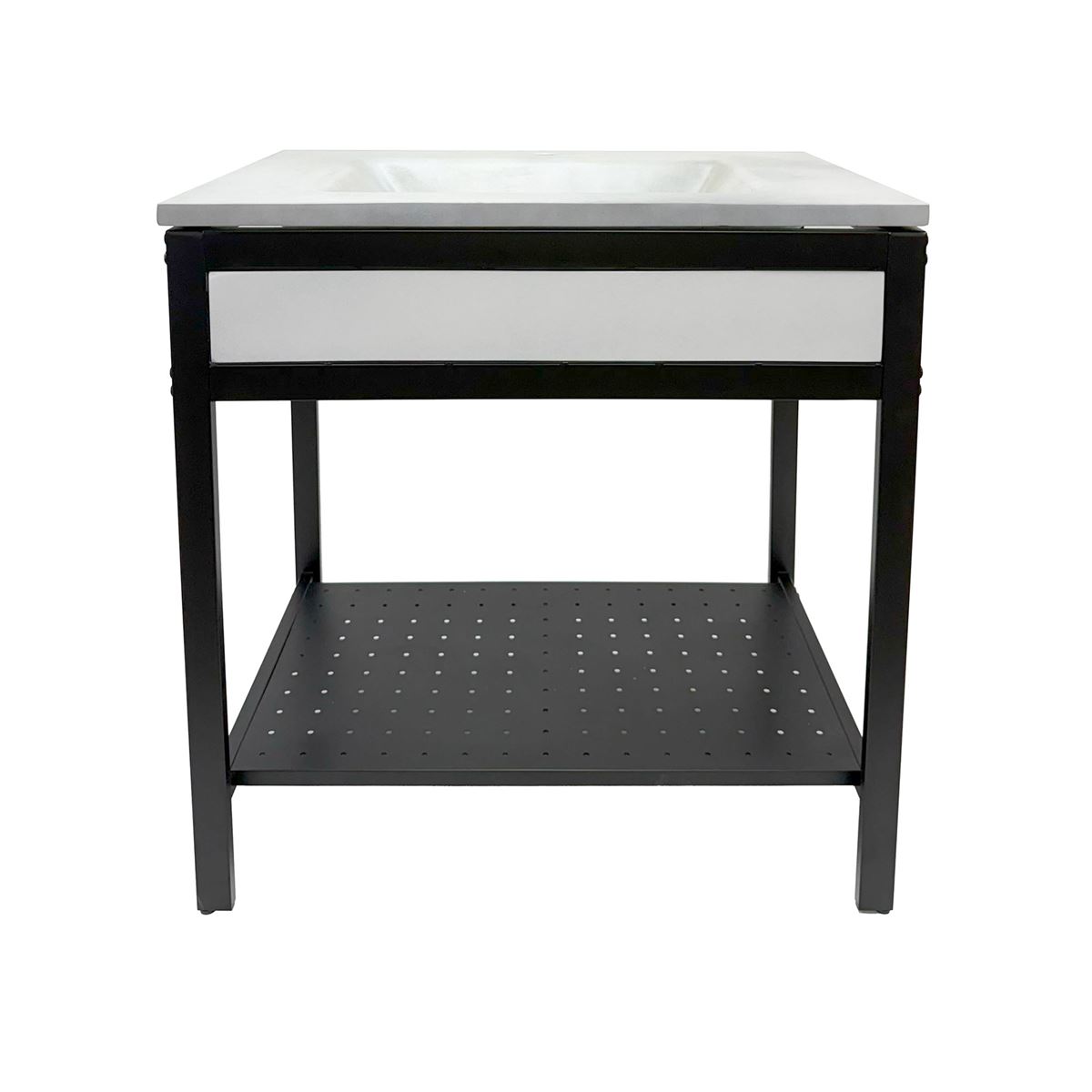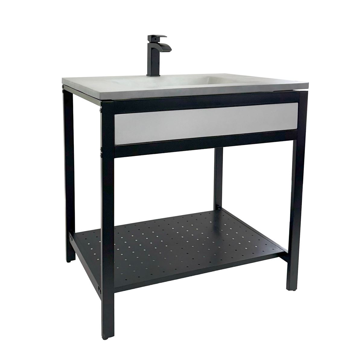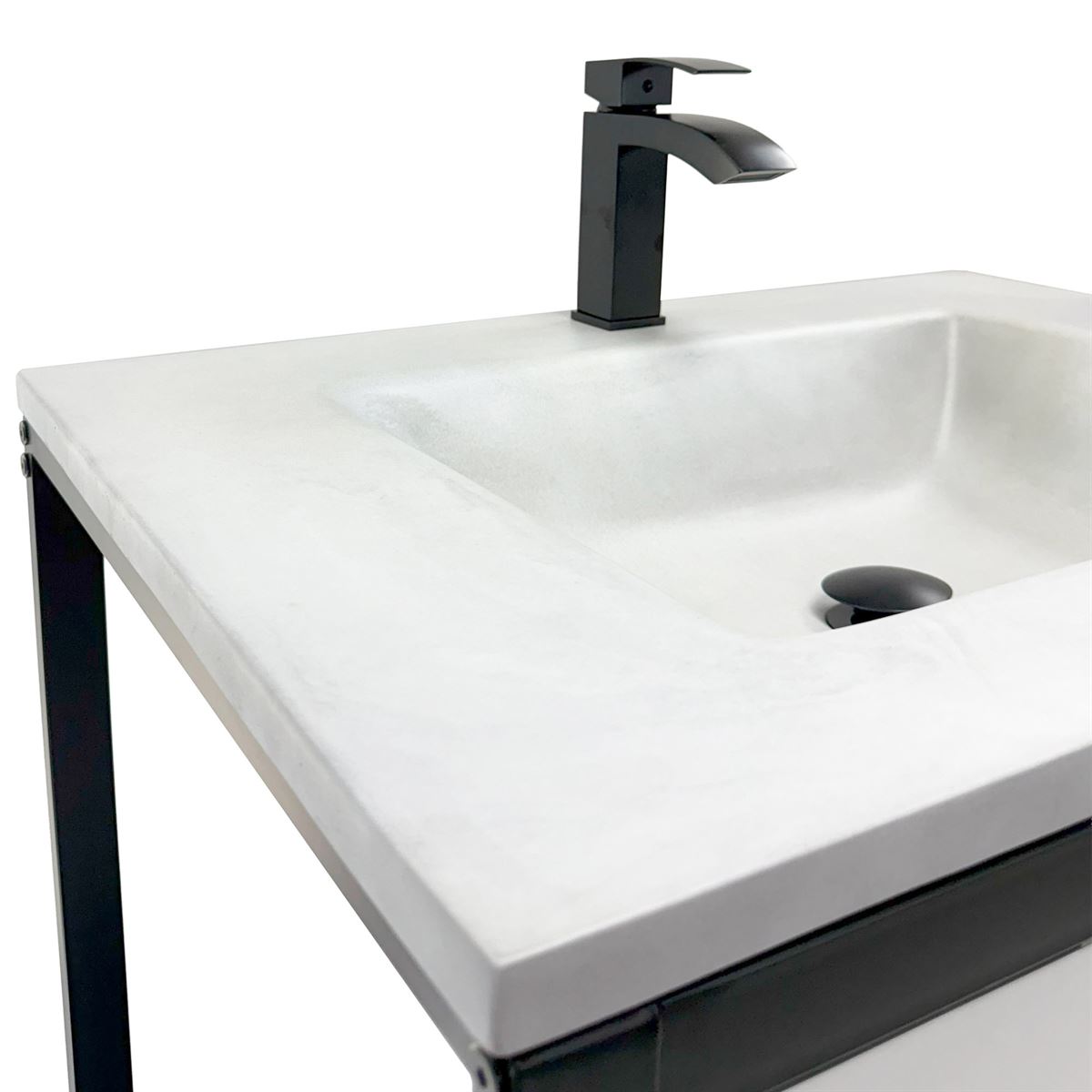 Elevate your space with this metal framed bathroom vanity featuring a sleek and unique concrete sinktop. The matte black metal frame provides a modern, industrial edge while ensuring durability and stability for daily use. With a large open bottom shelf for easy storage, this vanity combines practicality and style, keeping your bathroom organized and clutter-free. The matching concrete front piece complements the sinktop, which gives a visually cohesive look. This vanity is incredibly durable, easy to clean, and low-maintenance. Designed to enhance your space, this vanity seamlessly blends functionality with beauty, making it the perfect addition to any modern bathroom.
