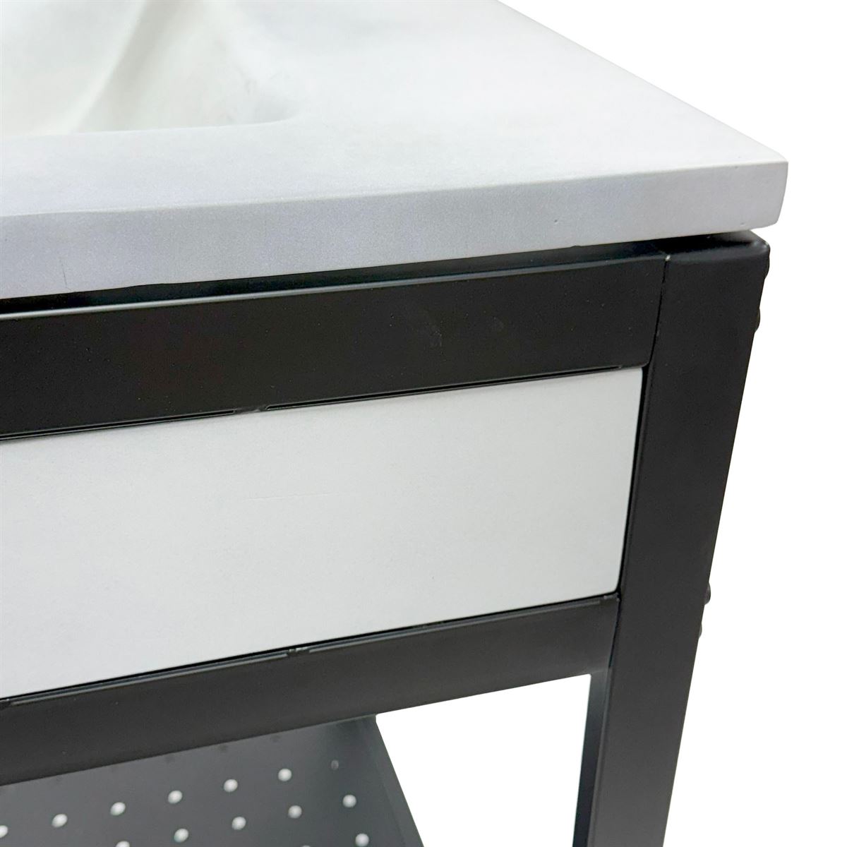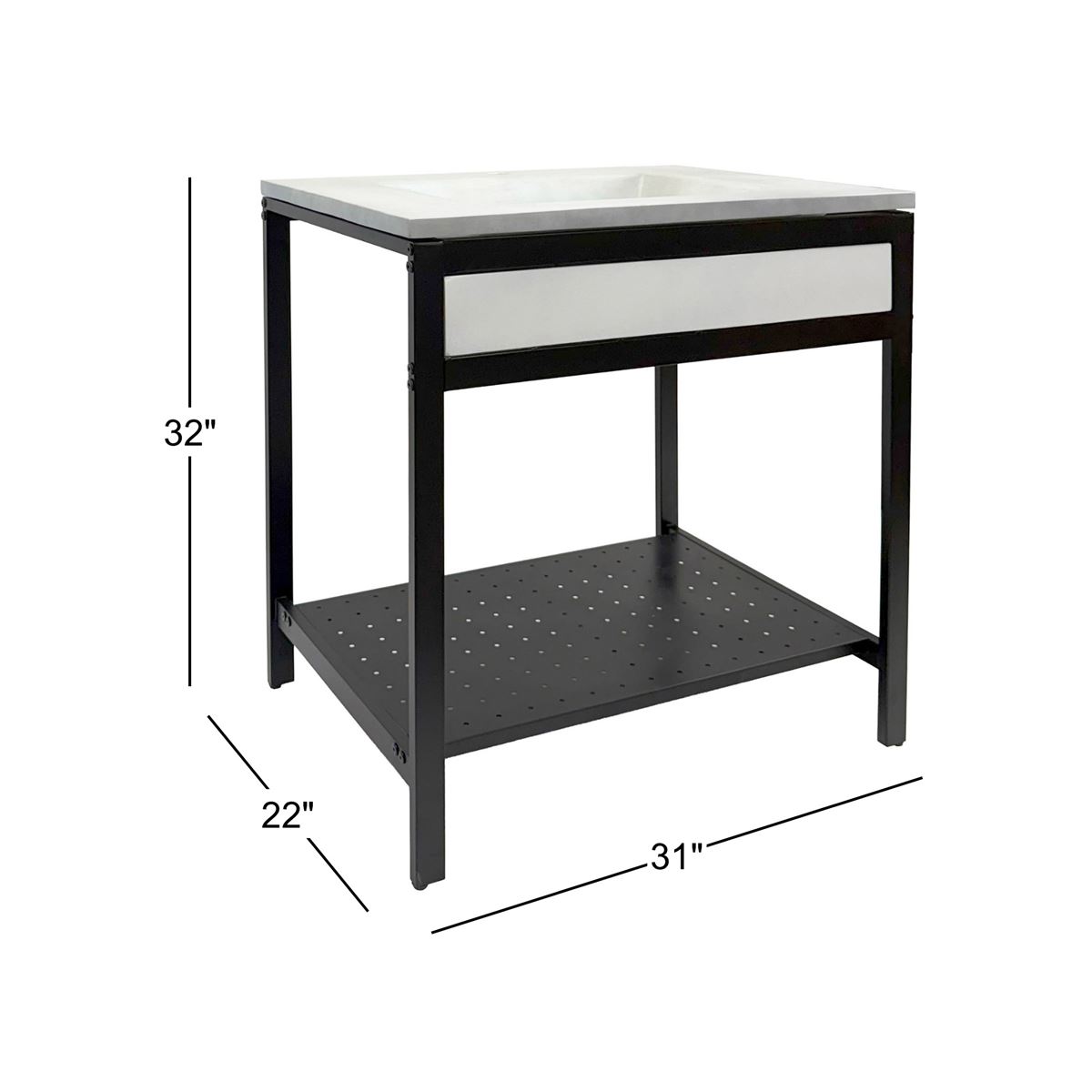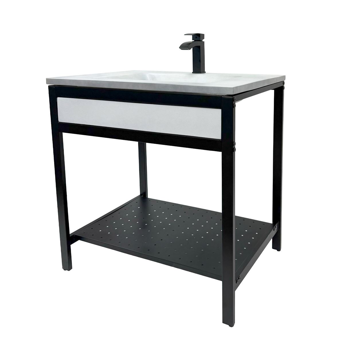 Elevate your space with this metal framed bathroom vanity featuring a sleek and unique concrete sinktop. The matte black metal frame provides a modern, industrial edge while ensuring durability and stability for daily use. With a large open bottom shelf for easy storage, this vanity combines practicality and style, keeping your bathroom organized and clutter-free. The matching concrete front piece complements the sinktop, which gives a visually cohesive look. This vanity is incredibly durable, easy to clean, and low-maintenance. Designed to enhance your space, this vanity seamlessly blends functionality with beauty, making it the perfect addition to any modern bathroom.