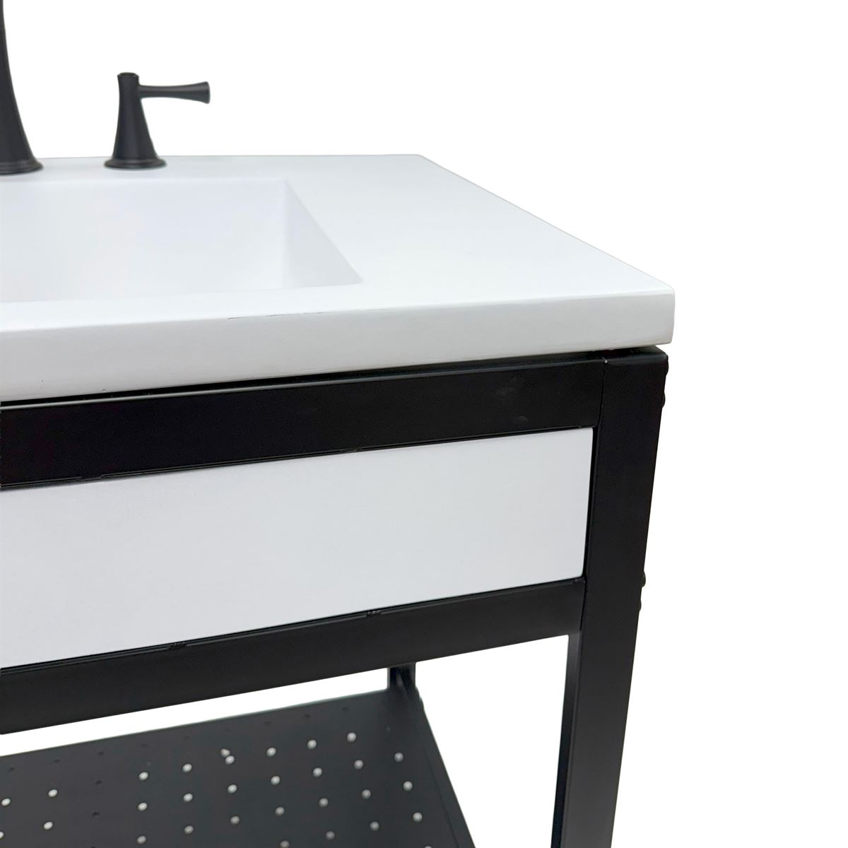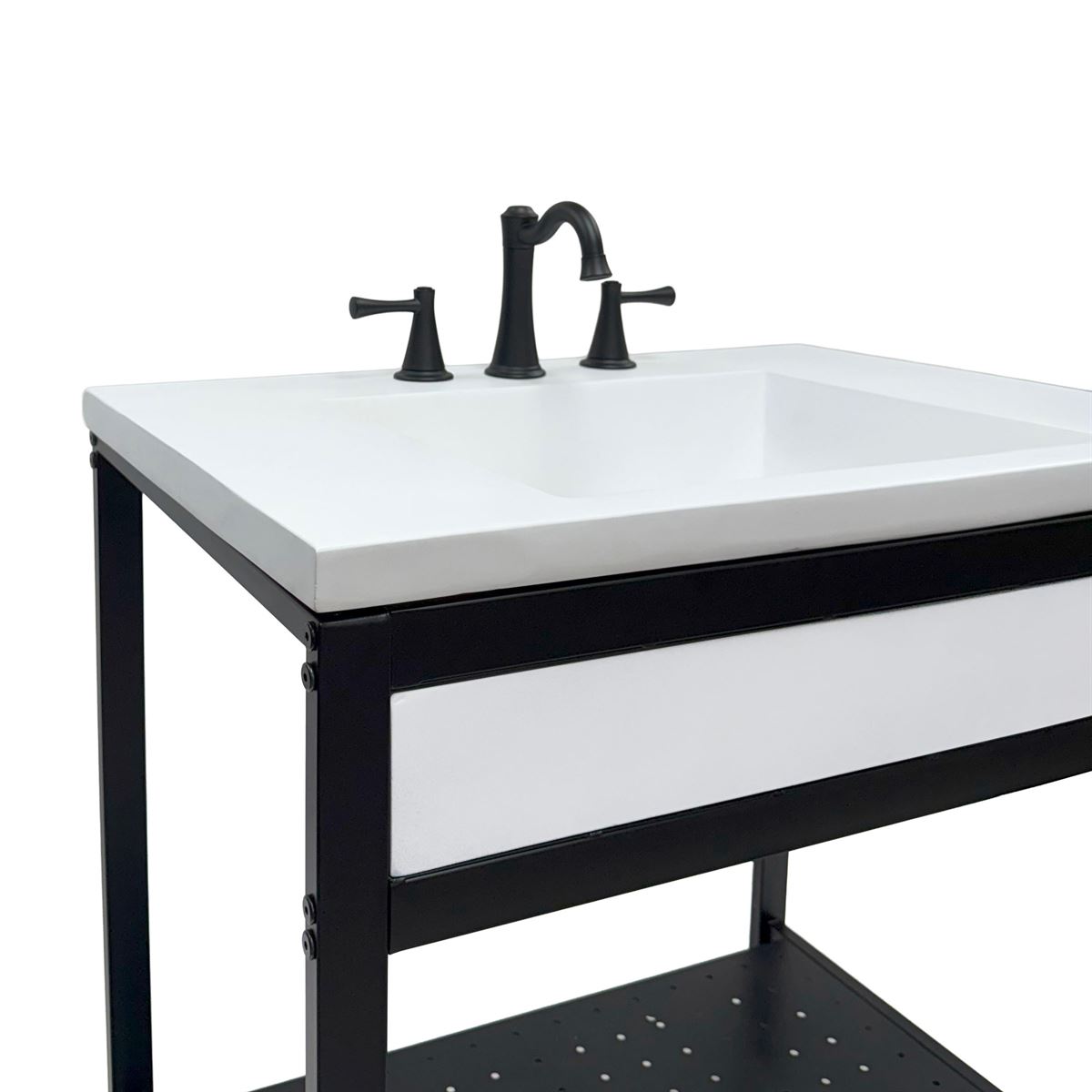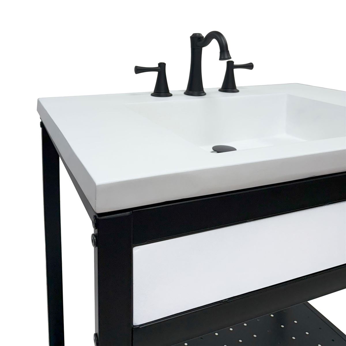 - Matte black metal framed vanity