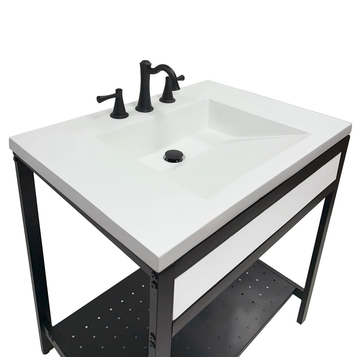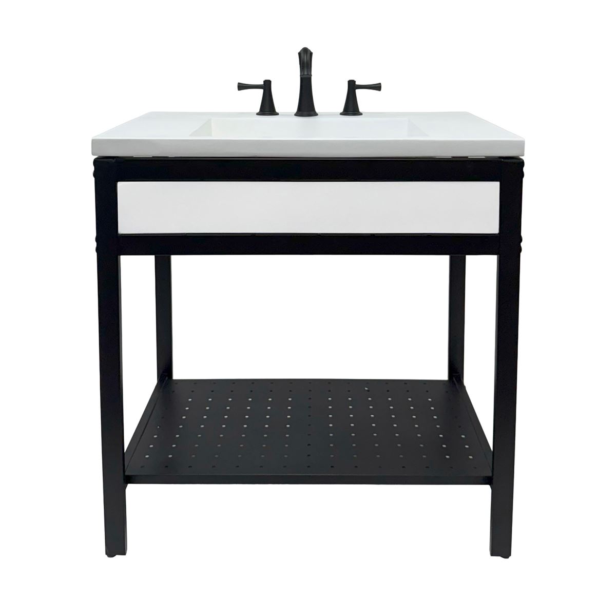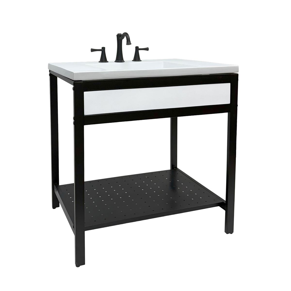 - Matte black metal framed vanity