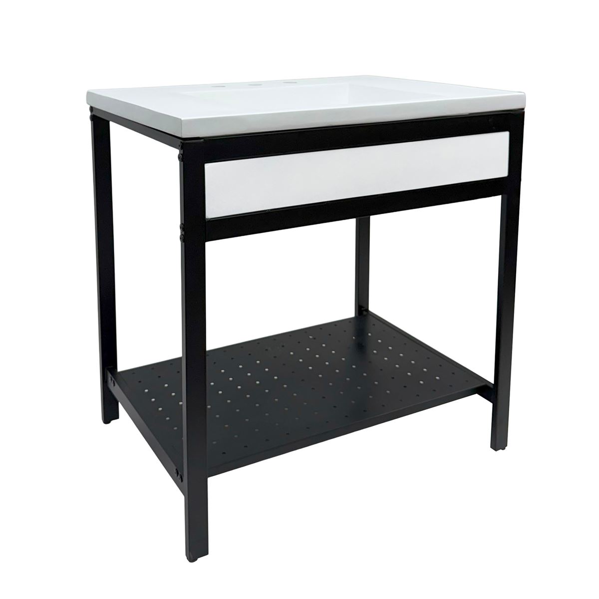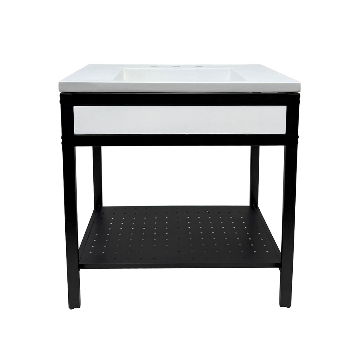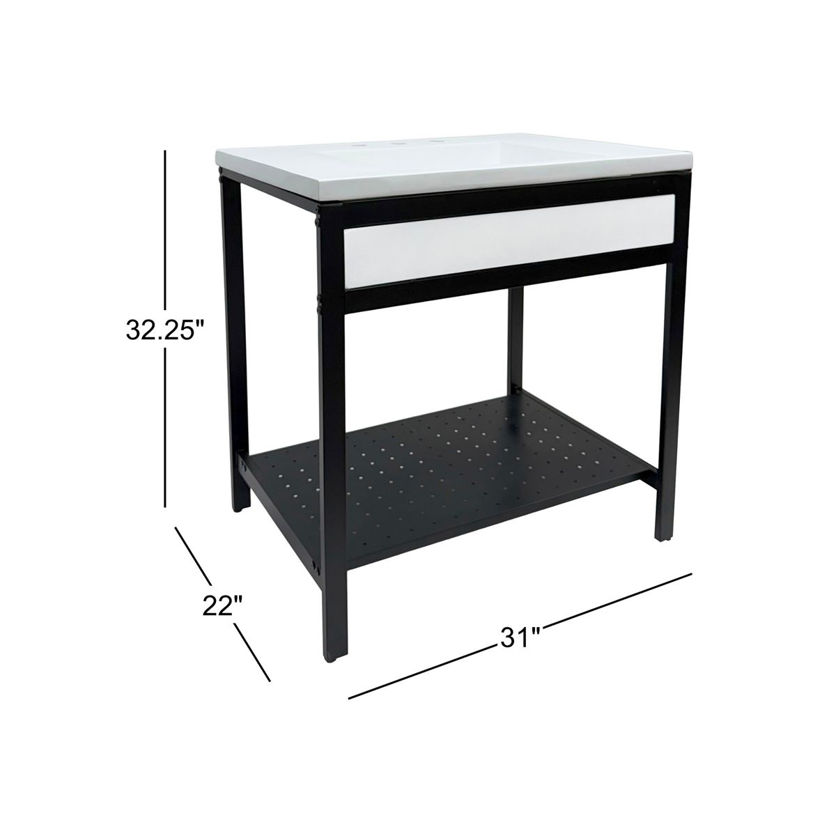 Elevate your space with this metal framed bathroom vanity featuring a sleek and unique concrete sinktop. The matte black metal frame provides a modern, industrial edge while ensuring durability and stability for daily use. With a large open bottom shelf for easy storage, this vanity combines practicality and style, keeping your bathroom organized and clutter-free. The matching concrete front piece complements the sinktop, which gives a visually cohesive look. This vanity is incredibly durable, easy to clean, and low-maintenance. Designed to enhance your space, this vanity seamlessly blends functionality with beauty, making it the perfect addition to any modern bathroom.