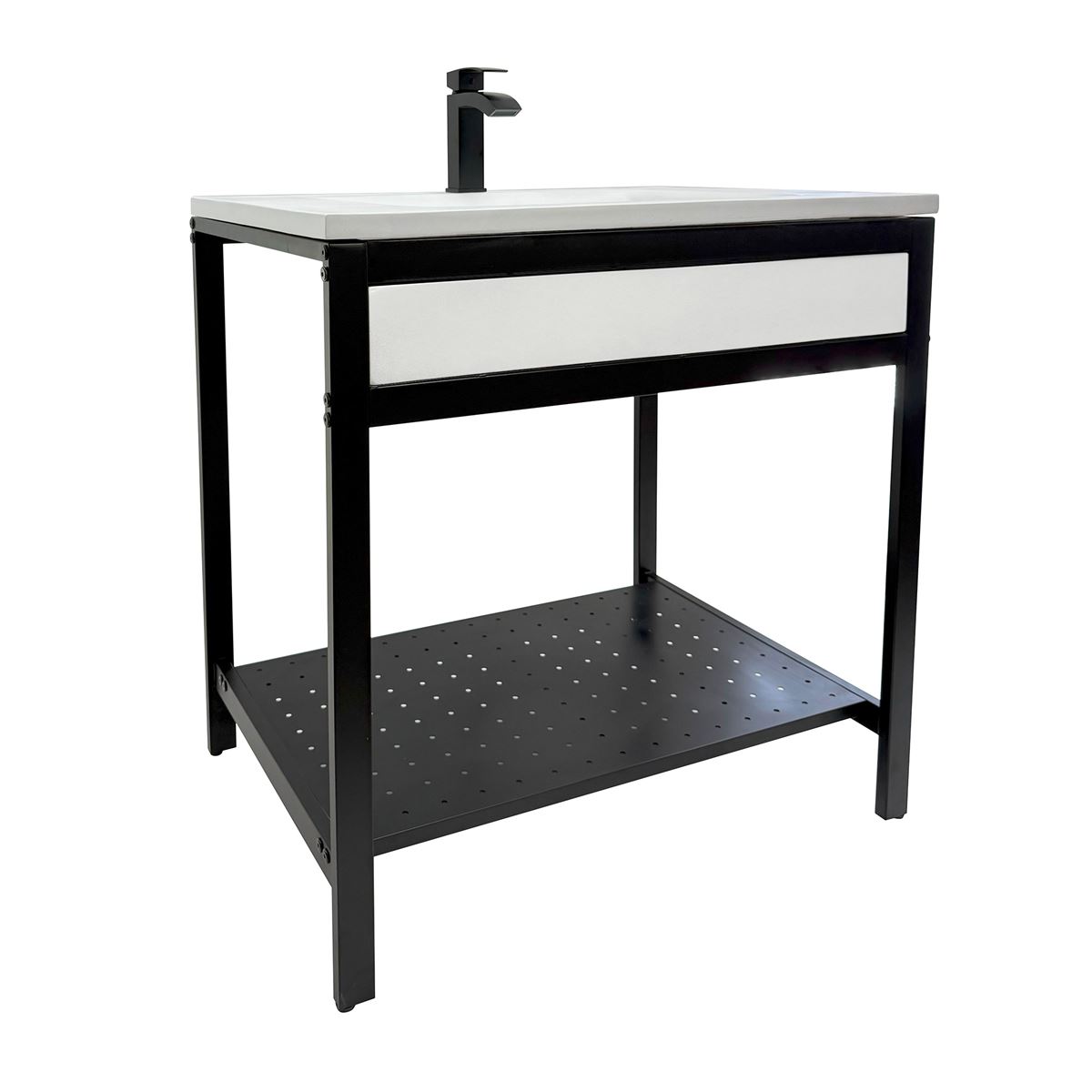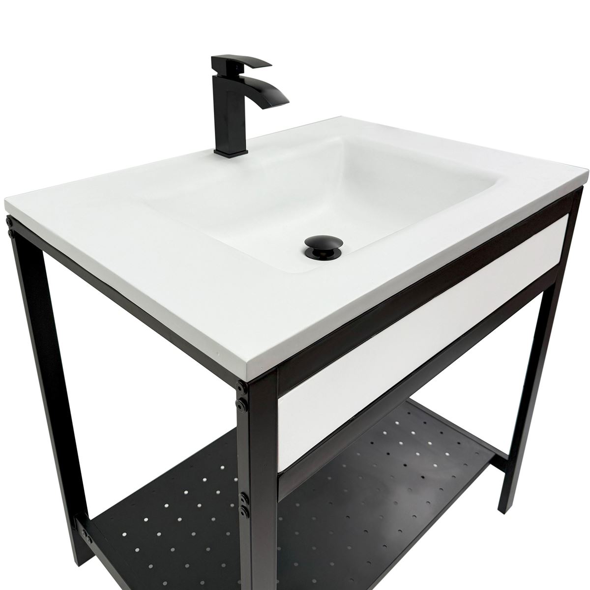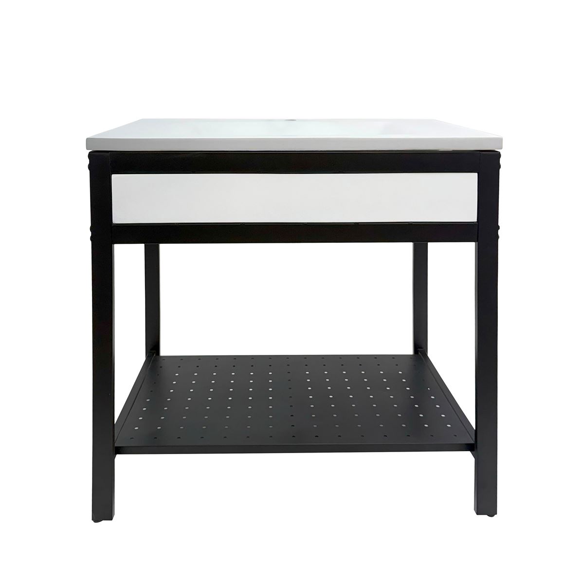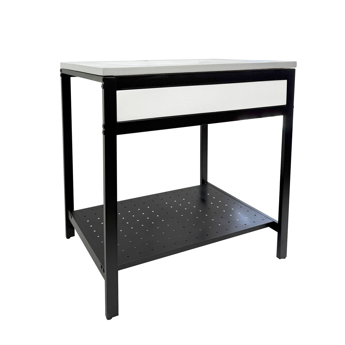 Elevate your space with this metal framed bathroom vanity featuring a sleek and unique concrete sinktop. The matte black metal frame provides a modern, industrial edge while ensuring durability and stability for daily use. With a large open bottom shelf for easy storage, this vanity combines practicality and style, keeping your bathroom organized and clutter-free. The matching concrete front piece complements the sinktop, which gives a visually cohesive look. This vanity is incredibly durable, easy to clean, and low-maintenance. Designed to enhance your space, this vanity seamlessly blends functionality with beauty, making it the perfect addition to any modern bathroom.