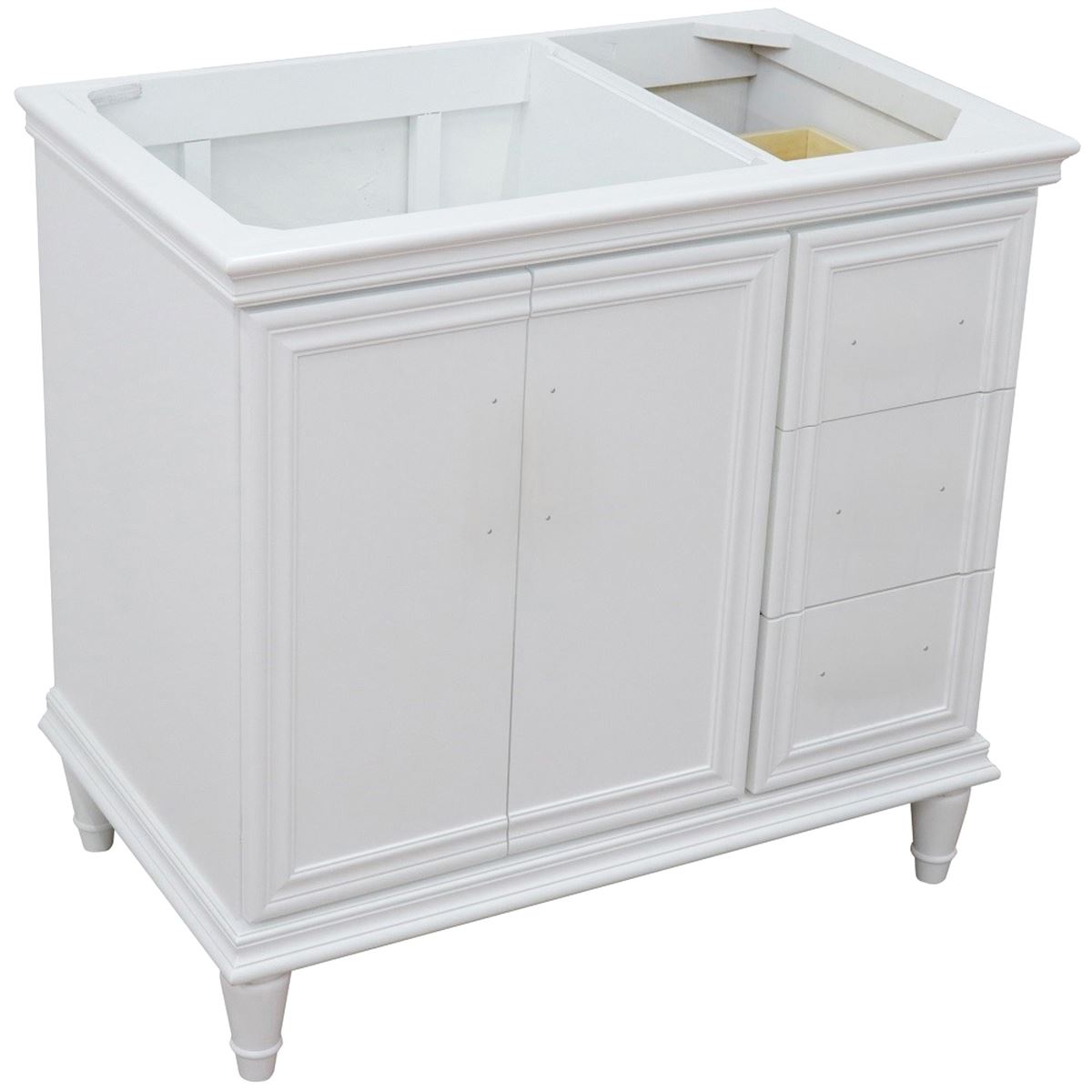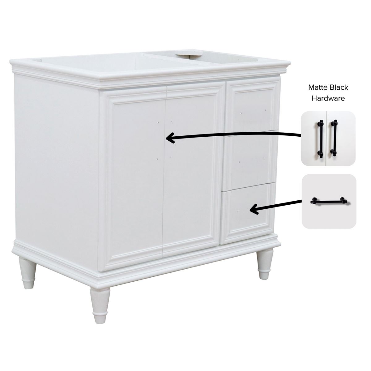 The Forli collection by Bellaterra Home features stunning bathroom vanities that can seamlessly integrate with any home design. The classic simplicity and elegance of this beautifully crafted piece of furniture will be the highly appreciated focal point in your bathroom. This vanity has three drawers and two cabinet doors that opens to a large ample storage space. The drawers are constructed with English dovetail and are installed with smooth full extension glides to provide durability. This vanity features black finish hardware and a beautiful counter top that is pre-sealed and polished for added protection. The bathroom vanity top is preinstalled with a white cUPC certified ceramic sink.