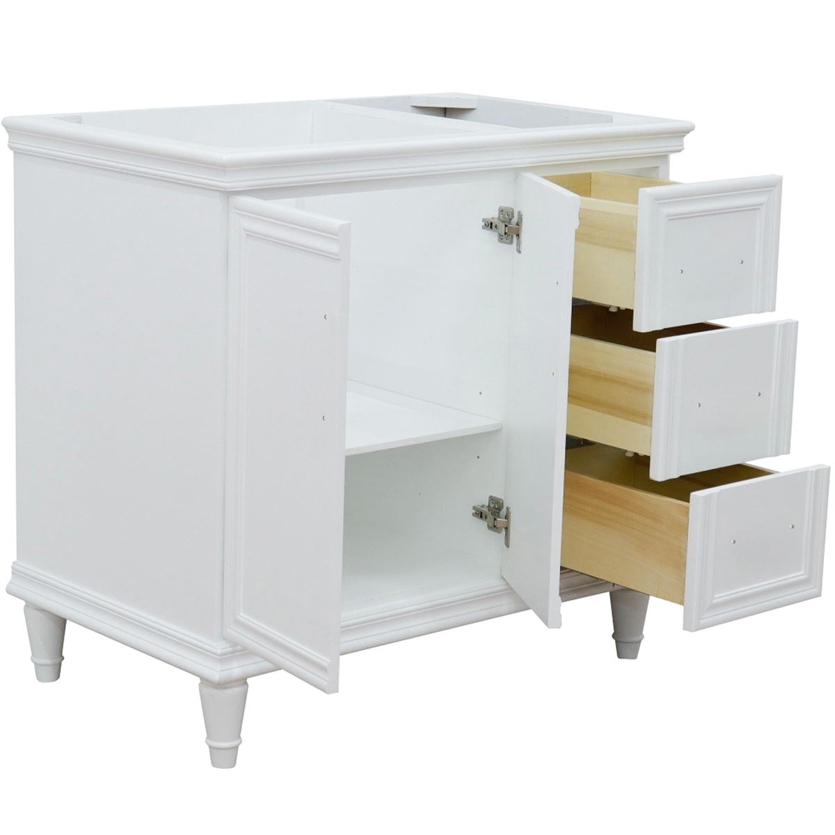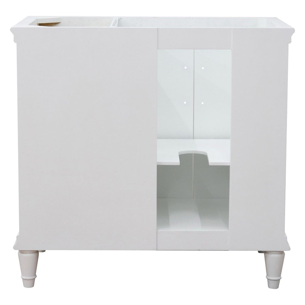 The Forli collection by Bellaterra Home features stunning bathroom vanities that can seamlessly integrate with any home design. The classic simplicity and elegance of this beautifully crafted piece of furniture will be the highly appreciated focal point in your bathroom. This vanity has three drawers and two cabinet doors that opens to a large ample storage space. The drawers are constructed with English dovetail and are installed with smooth full extension glides to provide durability. This vanity features black finish hardware and a beautiful counter top that is pre-sealed and polished for added protection. The bathroom vanity top is preinstalled with a white cUPC certified ceramic sink.