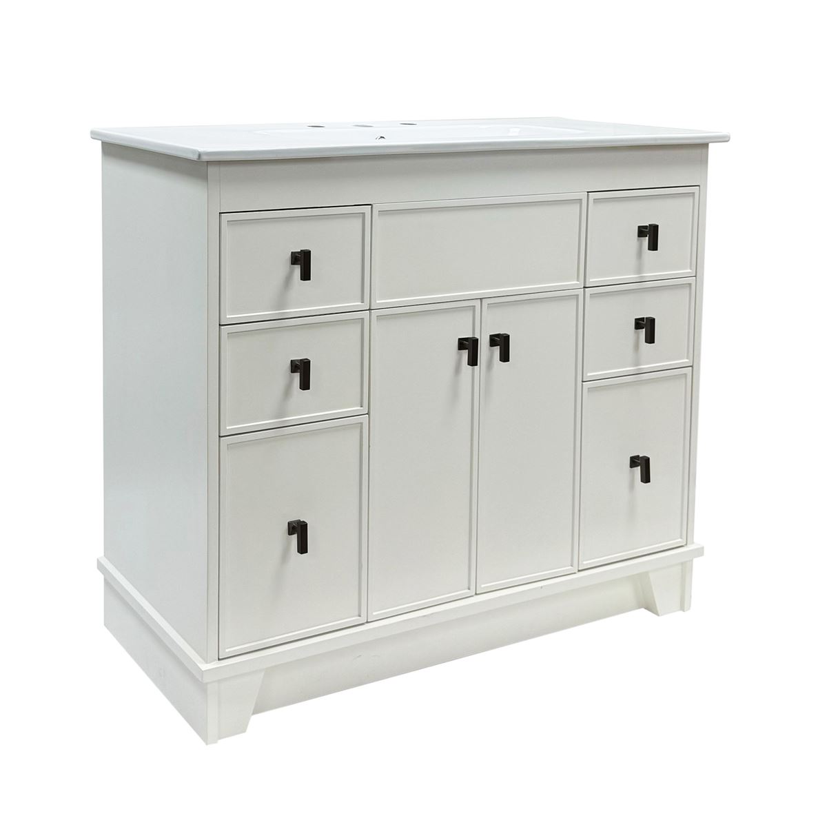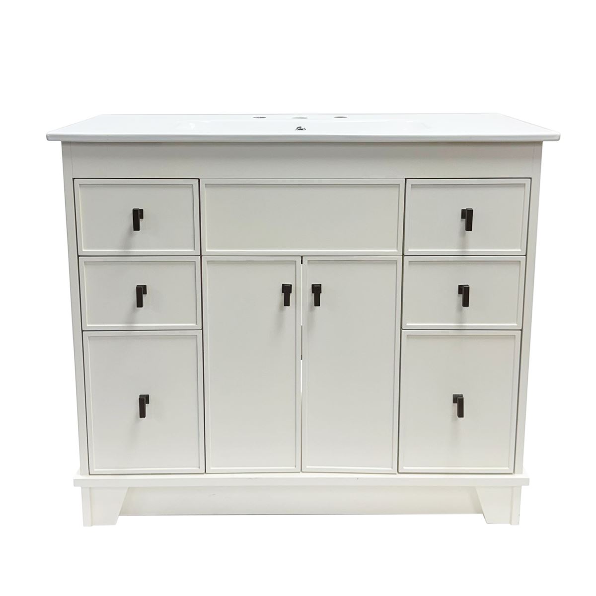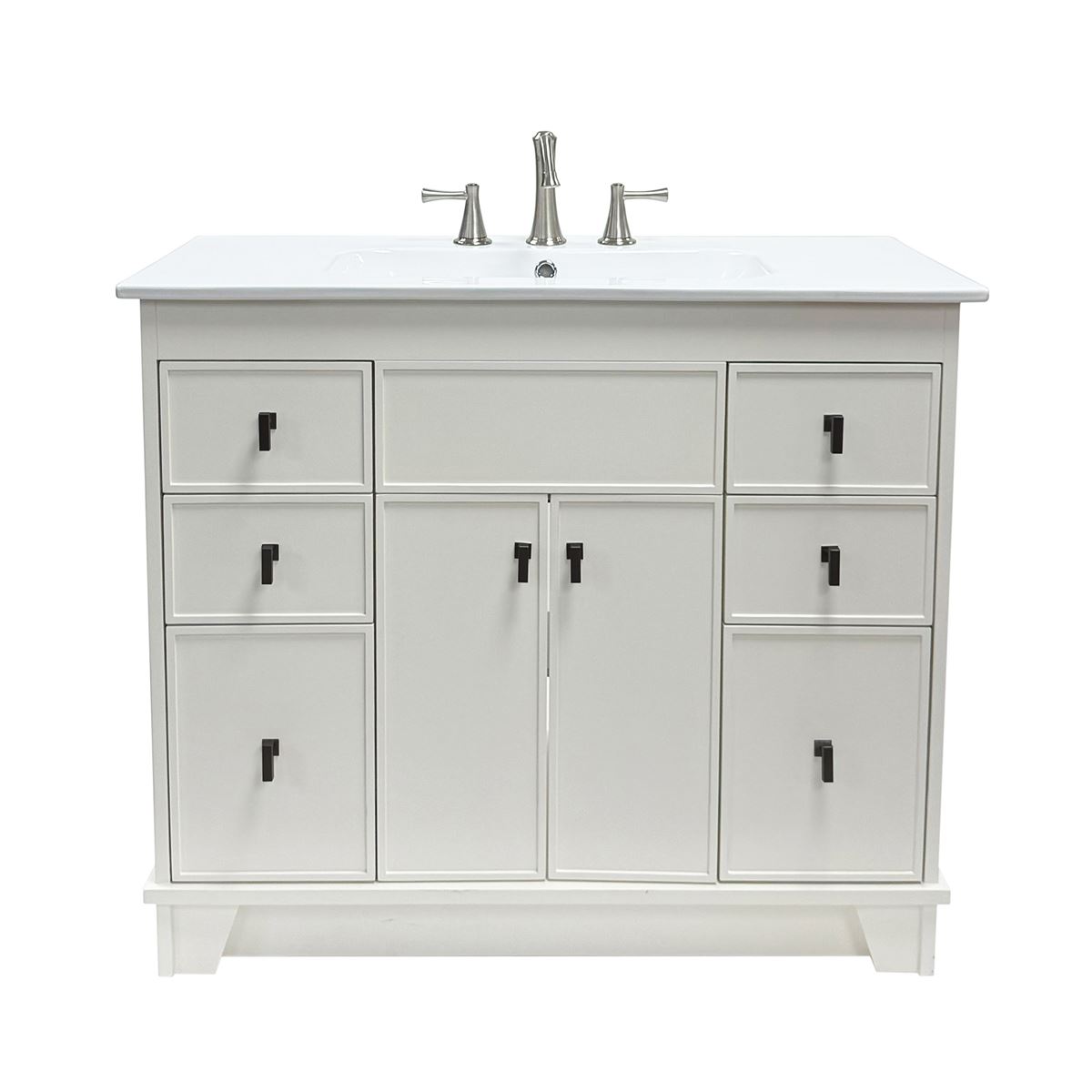 This single bathroom vanity brings clean lines and extra storage space to your main bathroom or guest bath. It's made from solid wood with a fresh, breezy finish that works well with any aesthetic, from coastal to the farmhouse. The 40" wide ceramic sink top surface gives you enough room for your daily use. There are two cabinet doors and six pull-out drawers with inset paneling open up to reveal ample storage space for big and small household items.