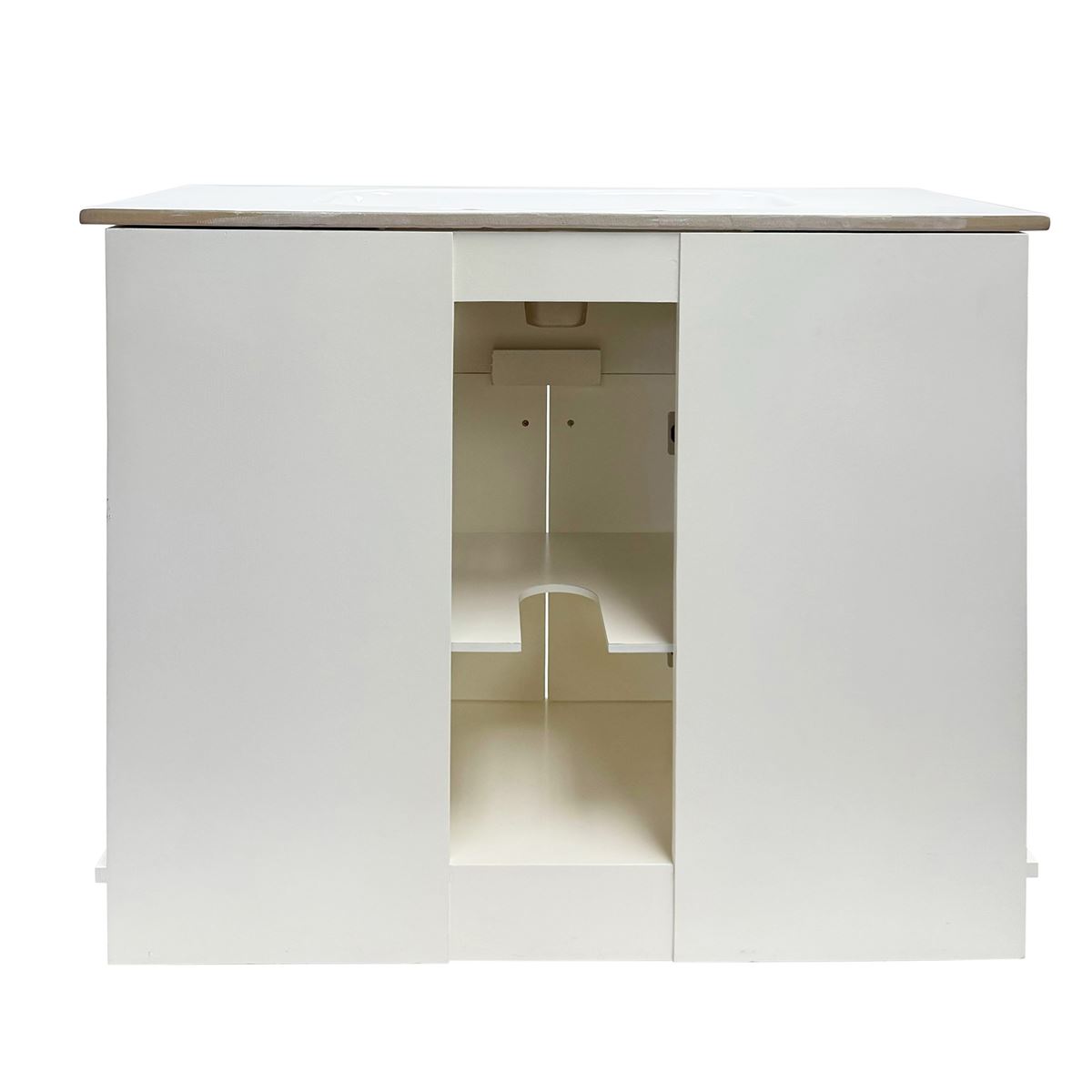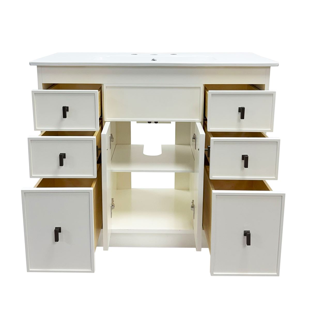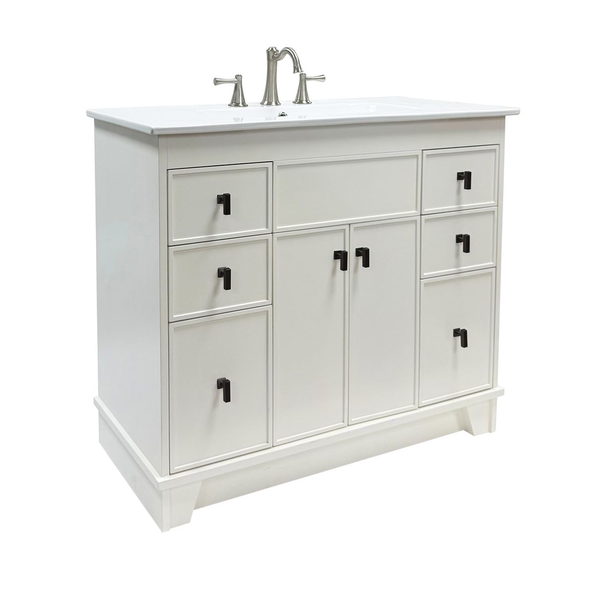 This single bathroom vanity brings clean lines and extra storage space to your main bathroom or guest bath. It's made from solid wood with a fresh, breezy finish that works well with any aesthetic, from coastal to the farmhouse. The 40" wide ceramic sink top surface gives you enough room for your daily use. There are two cabinet doors and six pull-out drawers with inset paneling open up to reveal ample storage space for big and small household items.