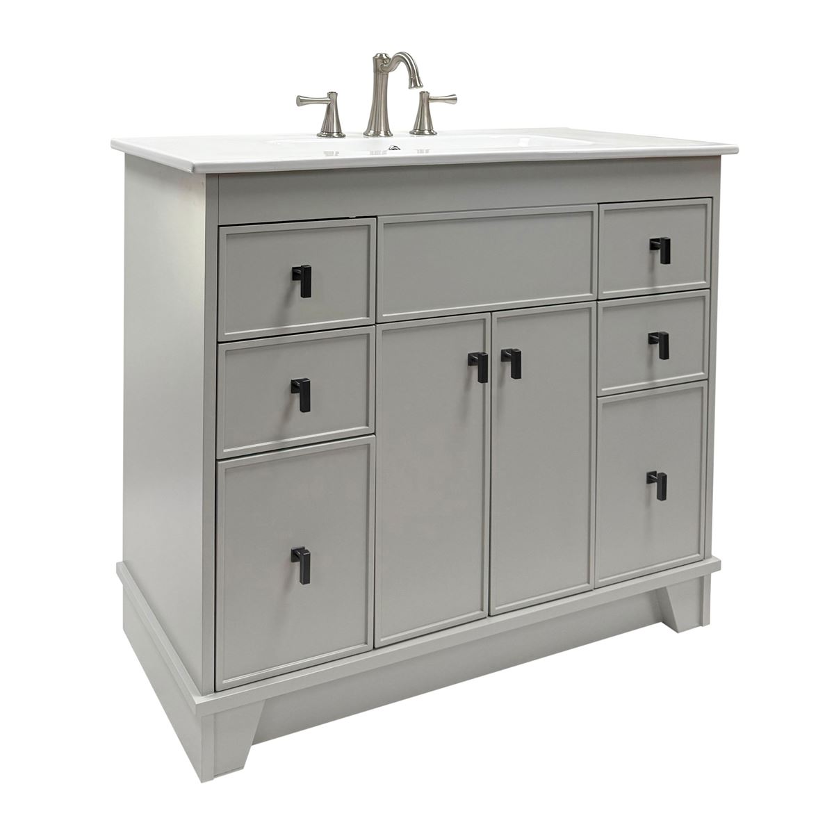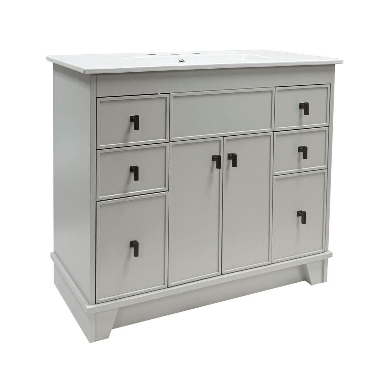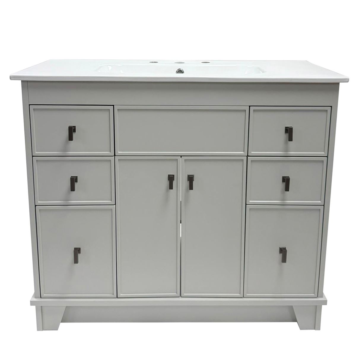 This single bathroom vanity brings clean lines and extra storage space to your main bathroom or guest bath. It's made from solid wood with a fresh, breezy finish that works well with any aesthetic, from coastal to the farmhouse. The 40" wide ceramic sink top surface gives you enough room for your daily use. There are two cabinet doors and six pull-out drawers with inset paneling open up to reveal ample storage space for big and small household items.