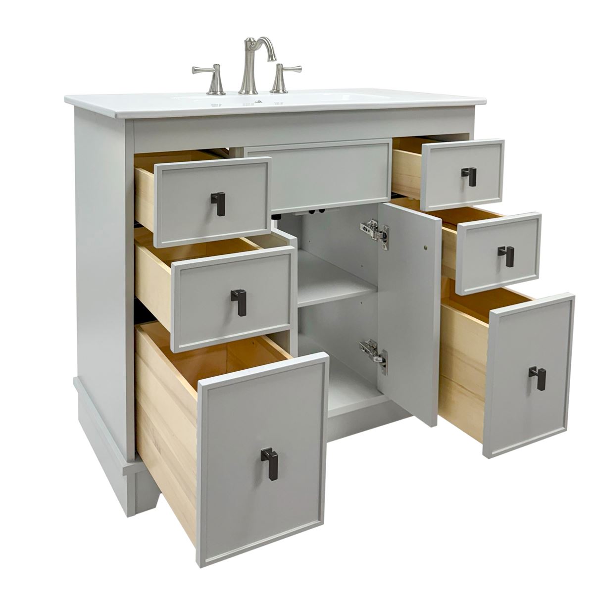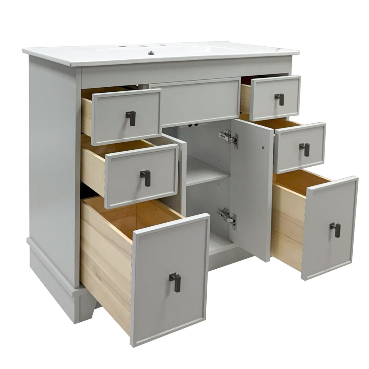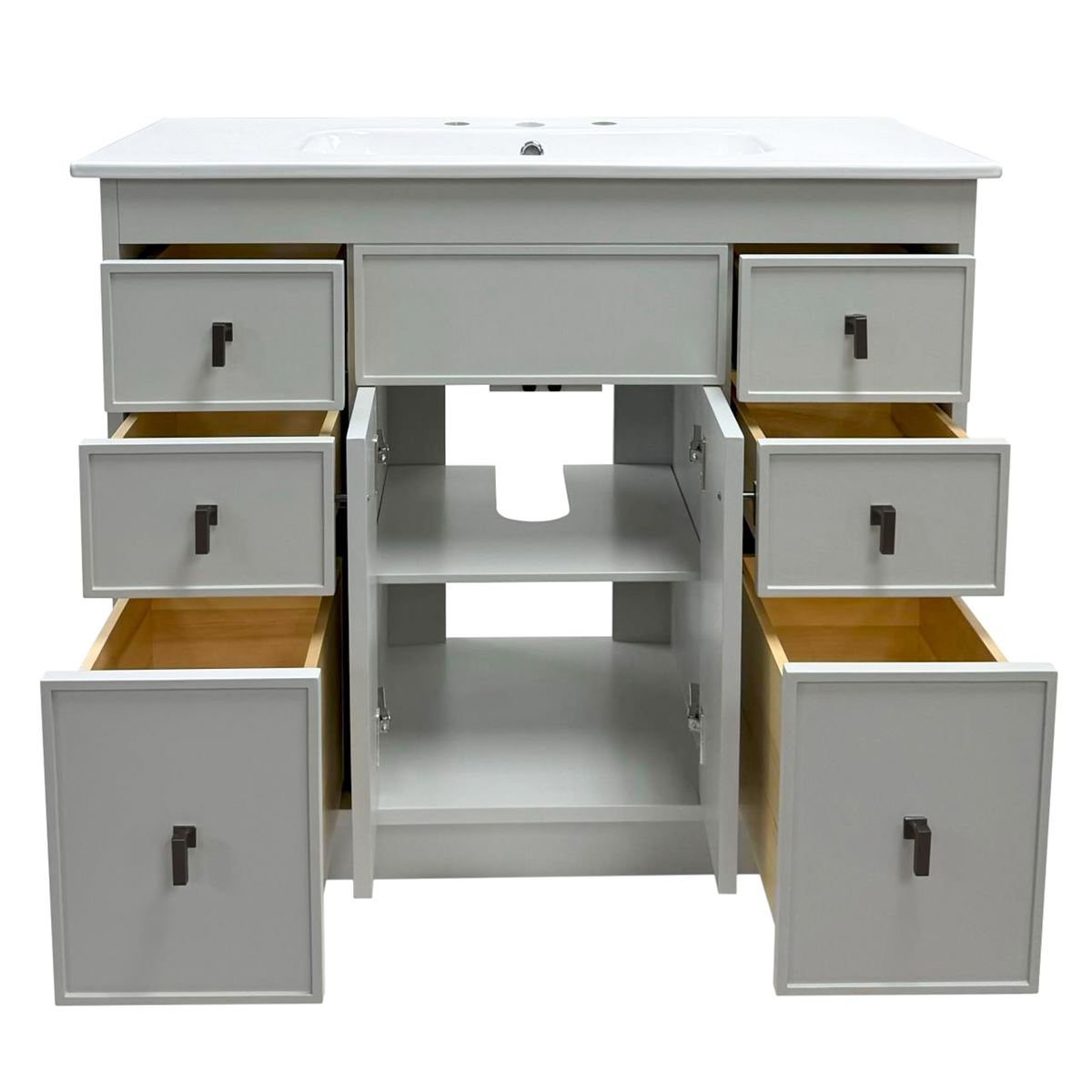 This single bathroom vanity brings clean lines and extra storage space to your main bathroom or guest bath. It's made from solid wood with a fresh, breezy finish that works well with any aesthetic, from coastal to the farmhouse. The 40" wide ceramic sink top surface gives you enough room for your daily use. There are two cabinet doors and six pull-out drawers with inset paneling open up to reveal ample storage space for big and small household items.