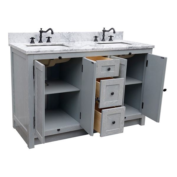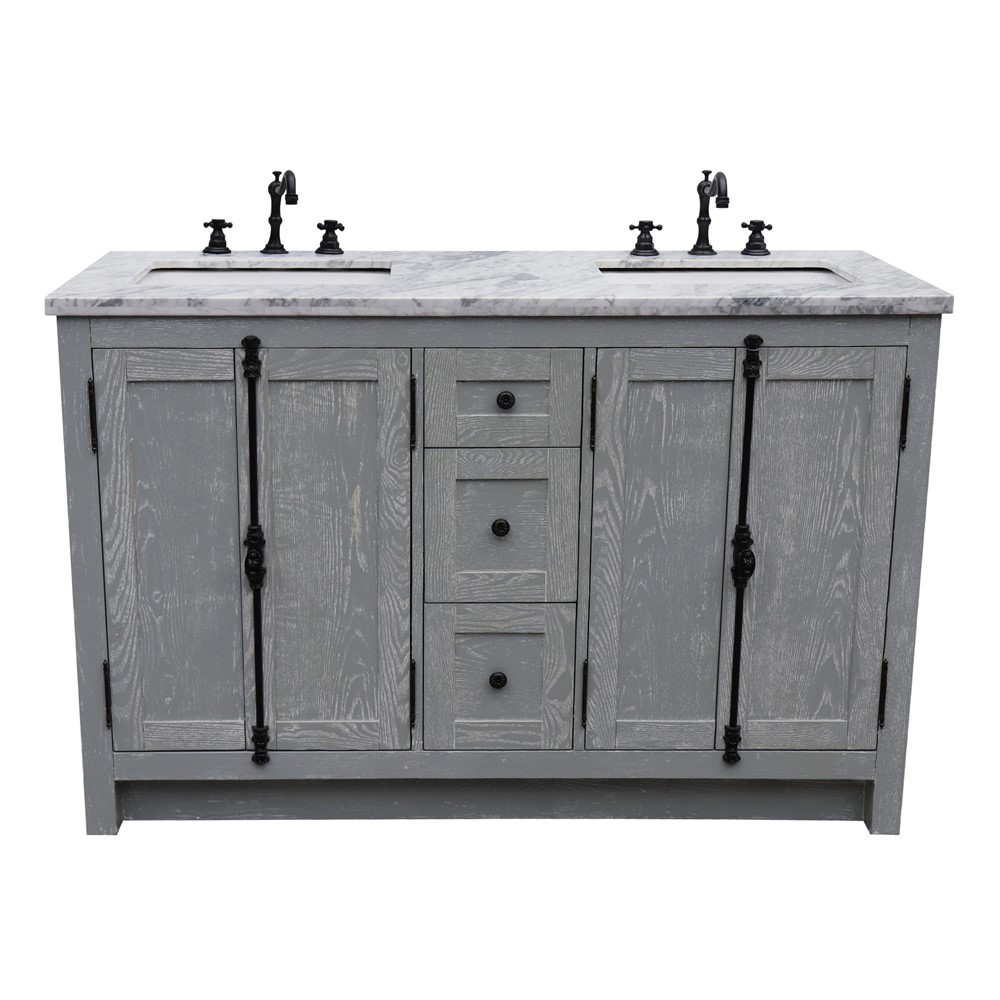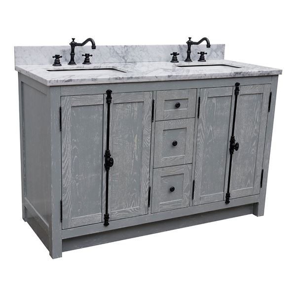The Plantation collection by Bellaterra Home features Plantation Style bathroom vanities that can accomplish any home design. From the cottage to the cabin or to the grand home design, you will appreciate this beautifully hand crafted piece of furniture as the focal point in your bathroom. The Plantation style wrought iron finish hardware enhances the unique look of this piece of art. The vanity is made with solid oak and plywood, topped with ash veneer to give the texture. It is hand applied with multiple layers of ecofriendly stain and top coat to prevent pealing, cracking and fading. The interior finish is consistent throughout and matches the exterior finish. The structure of the cabinet is built with solid oak and has full corner block on all corners for stability and to also provide additional support for the counter top. It has one interior adjustable shelf for storage and a big opening for plumbing installation. This collection offers a variety of finishes. Each cabinet is configured to work with our variety of countertops or any standard sized tops. This vanity is available in: Brown Ash (Dark brown), Glacier Ash (White), Gray Ash (Light gray).This elegant bathroom vanity top features a 1.3in. thick genuine stone top preinstalled with a white cUPC certified ceramic sinks and a matching backsplash is available for additional purchase for utmost beauty and functionality. It will easily match many home interiors. Our vanity tops are pre-drilled with faucet holes. Bellaterra Homes counter tops are pre-sealed and polished for added protection. All genuine stone material has its variation of veining pattern and color; every top will be slightly different.