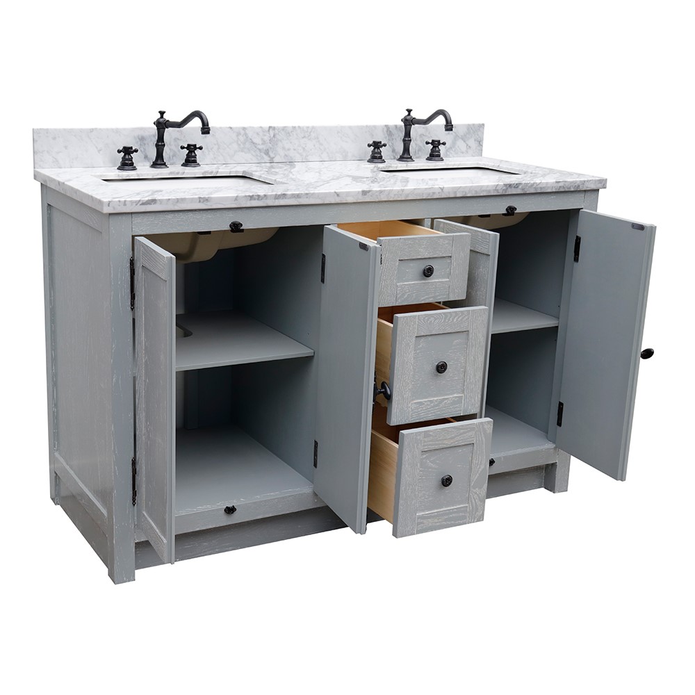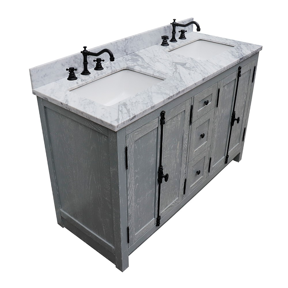 Wood and veneer over plywood construction, no MDF or particle boardAsh veneer adds texture and decorative touch to the cabinetEach cabinet is configured to work with our variety of countertops or any standard size topsEnglish Dovetail drawer constructionPlantation style wrought iron finish hardware Full corner block on all corners for stabilityInterior adjustable shelf for storage Hand applied with multiple layers of ecofriendly stain and top coat to prevent pealing, cracking and fadingHas toe-kick110 degree wrap aRound hingesGenuine White Carrara marblecUPC certified white ceramic sink factory pre-installed, no assembly required1.3 in. (33mm) thickness eased-edge elegant lookPre-drilled with 3 faucet holes for 8-in widespread faucet (faucet not included)
