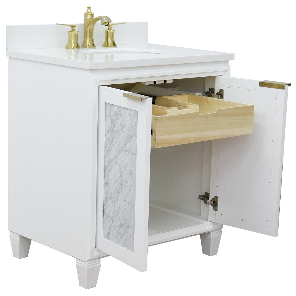 Constructed from solid oak wood, birch veneer, and plywoodSoft close door hinges and full extension drawer glidesInterior drawer that is sectioned for easy and functional organizationDovetail drawer constructionHigh quality gold hardware includedSturdy and charming cabinet legs add definition to the vanityAmple space for plenty of bathroom storageMulti-layer waterproof top coat protects against bathroom humidity Cabinet comes fully assembledLarge back opening for easy plumbing installationVanity top is pre-drilled with 3 faucet holes for an 8 in. widespread faucet (faucet not included)cUPC certified white ceramic sink is factory pre-installed to stone top (Backsplash not included)Extra deep drawersGenuine marble insert on doors add the luxurious feelExtra wide drawer pull