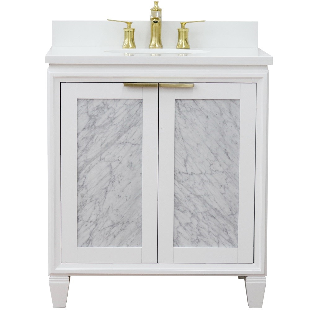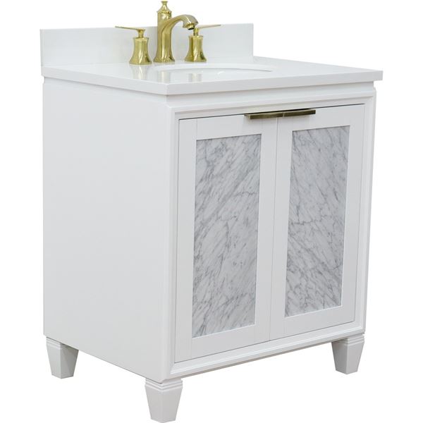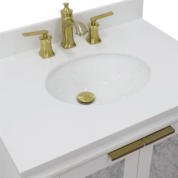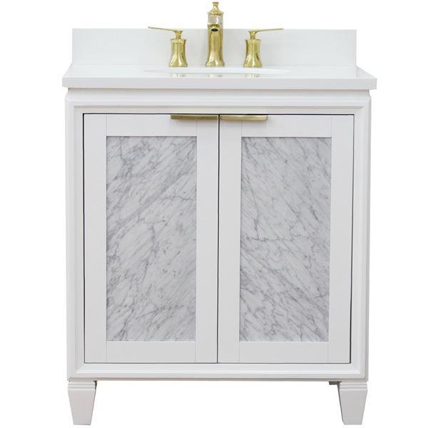 The Trento collection by Bellaterra Home features freestanding style bathroom vanities that can integrate seamlessly with any home design. From a simple or to the grand home design, you will appreciate this beautifully crafted piece of furniture as the focal point in your bathroom. The structure of the cabinet is built with solid oak. The vanity has three drawers and four cabinet doors that open to a large ample storage space. The drawers are constructed with English dovetail and are installed with smooth full extension glides to provide durability. The doors have genuine Italian Carrara marble inserts which make this vanity simply more elegant. This vanity features gold finish hardware and bathroom vanity top is preinstalled with white cUPC certified ceramic sink and a beautiful counter top that is pre-sealed and polished for added protection.