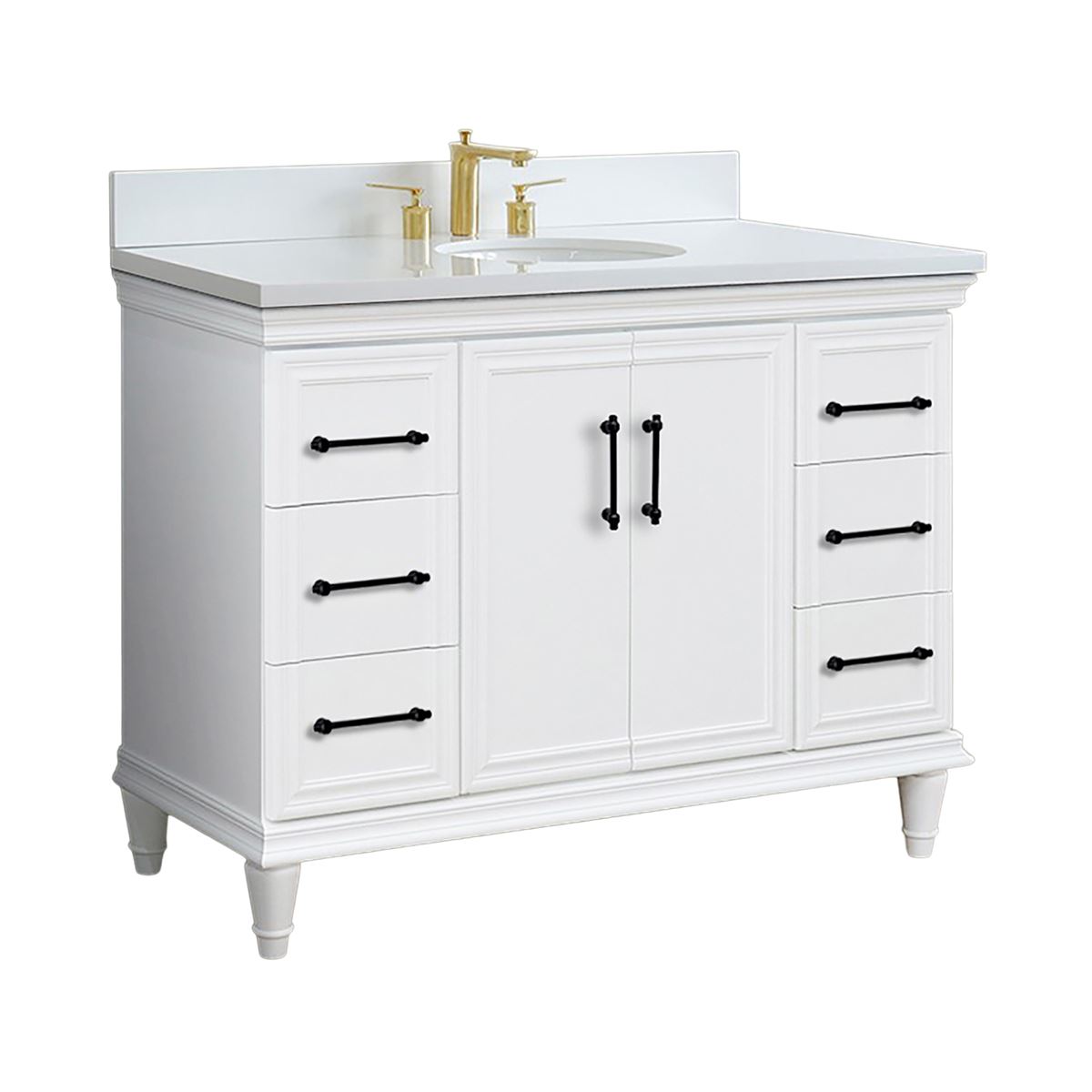 The Forli collection by Bellaterra Home features stunning bathroom vanities that can seamlessly integrate with any home design. The classic simplicity and elegance of this beautifully crafted piece of furniture will be the highly appreciated focal point in your bathroom. This vanity has six drawers and two cabinet doors that opens to a large ample storage space. The drawers are constructed with English dovetail and are installed with smooth full extension glides to provide durability. This vanity features black finish hardware and a beautiful counter top that is pre-sealed and polished for added protection. The bathroom vanity top is preinstalled with a white cUPC certified ceramic sink.