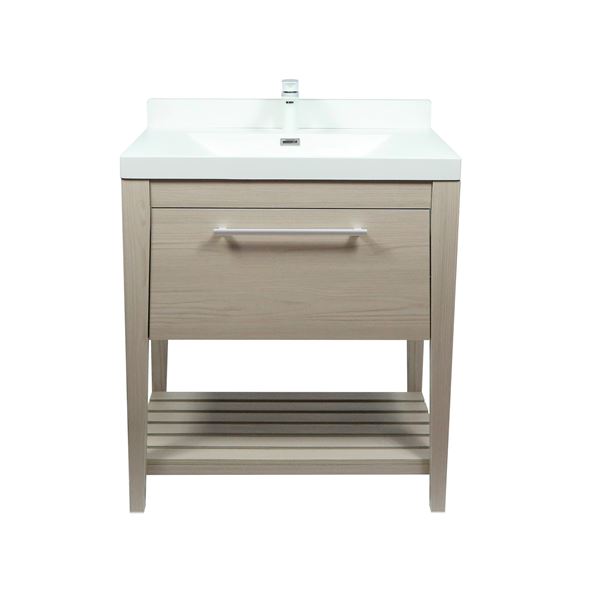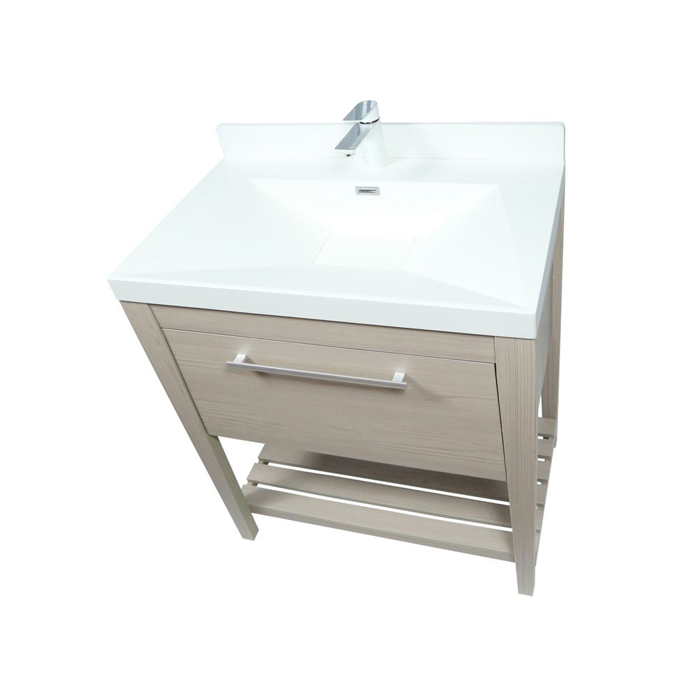 This 31.5-inch single sink transitional vanity has a beautiful, clean design that will rejuvenate any bathroom. It is constructed from high quality Melamine coated engineered wood, finished in a light gray wood color. Melamine is high scratch-resistant properties. It also does not stain easily. And to top it all, it is easy to clean. Melamine board provides a highly-level surface, which makes it an excellent material for making bathroom cabinets. This vanity base equipped with state of the art, soft closing drawer technology. The vanity features an integrated Composite Granite integral sink countertop resting above the main cabinet. The new trendy composite granite top is highly durable and low maintenance. Composite granite is an engineered blend of crushed quartz, calcium powder, stone dust, and acrylic resins. This material is much lighter than solid granite, but still fit for the challenge of handling your everyday demands. It is highly stain and heat resistant. This top radiates durability and sophistication, becoming the centerpiece for your vanity set. Faucet is not included; matching backsplash and mirror are available for separate purchase.
