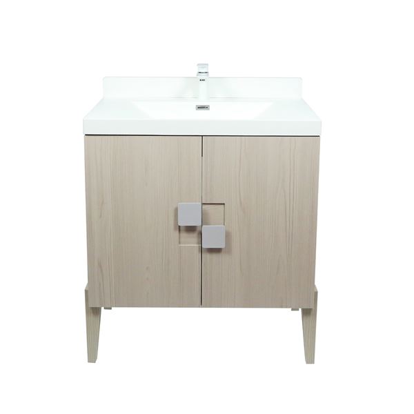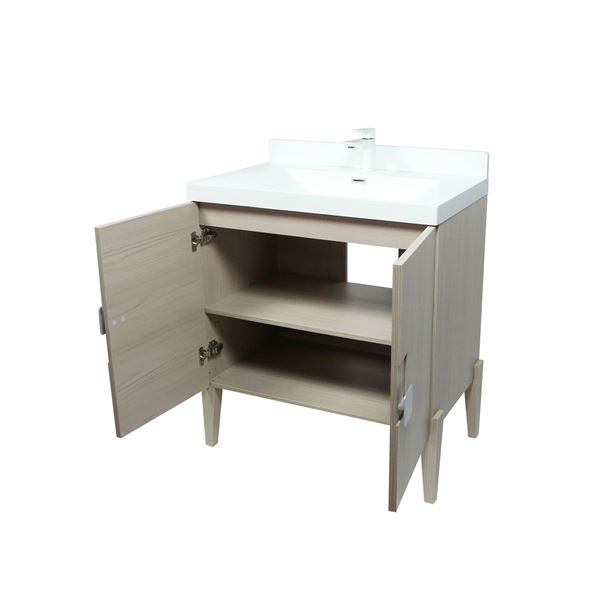 This 31.5-inch single sink transitional vanity has a beautiful, clean design that will rejuvenate any bathroom. It is constructed from high quality Melamine coated engineered wood, finished in a light gray wood color. Melamine is high scratch-resistant properties. It also does not stain easily. And to top it all, it is easy to clean. Melamine board provides a highly-level surface, which makes it an excellent material for making bathroom cabinets. This vanity base equipped with state of the art, soft closing door technology. The vanity features an integrated Composite Granite integral sink countertop resting above the main cabinet. The new trendy composite granite top is highly durable and low maintenance. Composite granite is an engineered blend of crushed quartz, calcium powder, stone dust, and acrylic resins. This material is much lighter than solid granite, but still fit for the challenge of handling your everyday demands. It is highly stain and heat resistant. This top radiates durability and sophistication, becoming the centerpiece for your vanity set. Faucet is not included; matching backsplash and mirror are available for separate purchase.