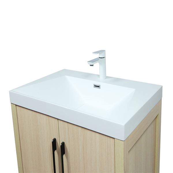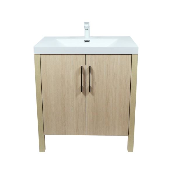 This 31.5-inch single sink transitional vanity has a beautiful, clean design that will rejuvenate any bathroom. It is constructed from high quality Melamine coated engineered wood, finished in a neutral wood color. Melamine is high scratch-resistant properties. It also does not stain easily. And to top it all, it is easy to clean. Melamine board provides a highly-level surface, which makes it an excellent material for making bathroom cabinets. This vanity base equipped with state of the art, soft closing door technology. The vanity features an integrated Composite Granite integral sink countertop resting above the main cabinet. The new trendy composite granite top is highly durable and low maintenance. Composite granite is an engineered blend of crushed quartz, calcium powder, stone dust, and acrylic resins. This material is much lighter than solid granite, but still fit for the challenge of handling your everyday demands. It is highly stain and heat resistant. This top radiates durability and sophistication, becoming the centerpiece for your vanity set. Faucet is not included; matching backsplash and mirror are available for separate purchase.