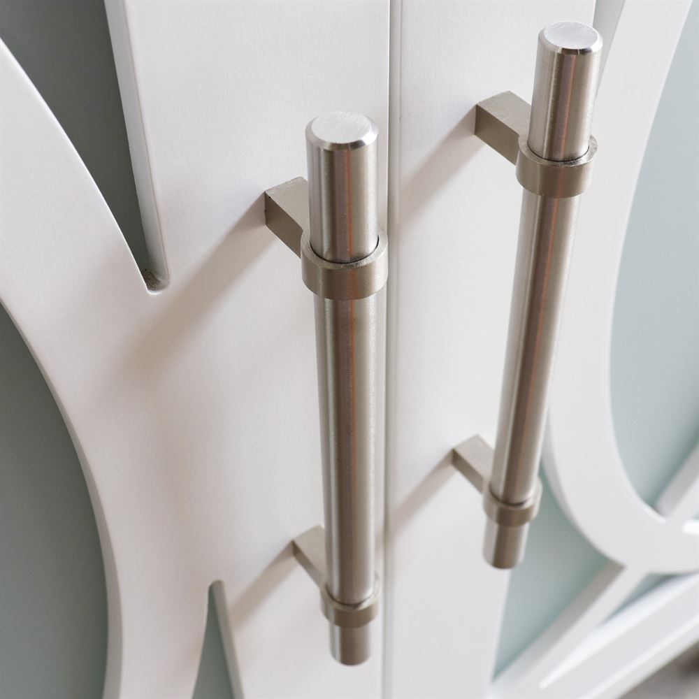 - Featuring a flat-front half circle motif door panels design with glass inserts.