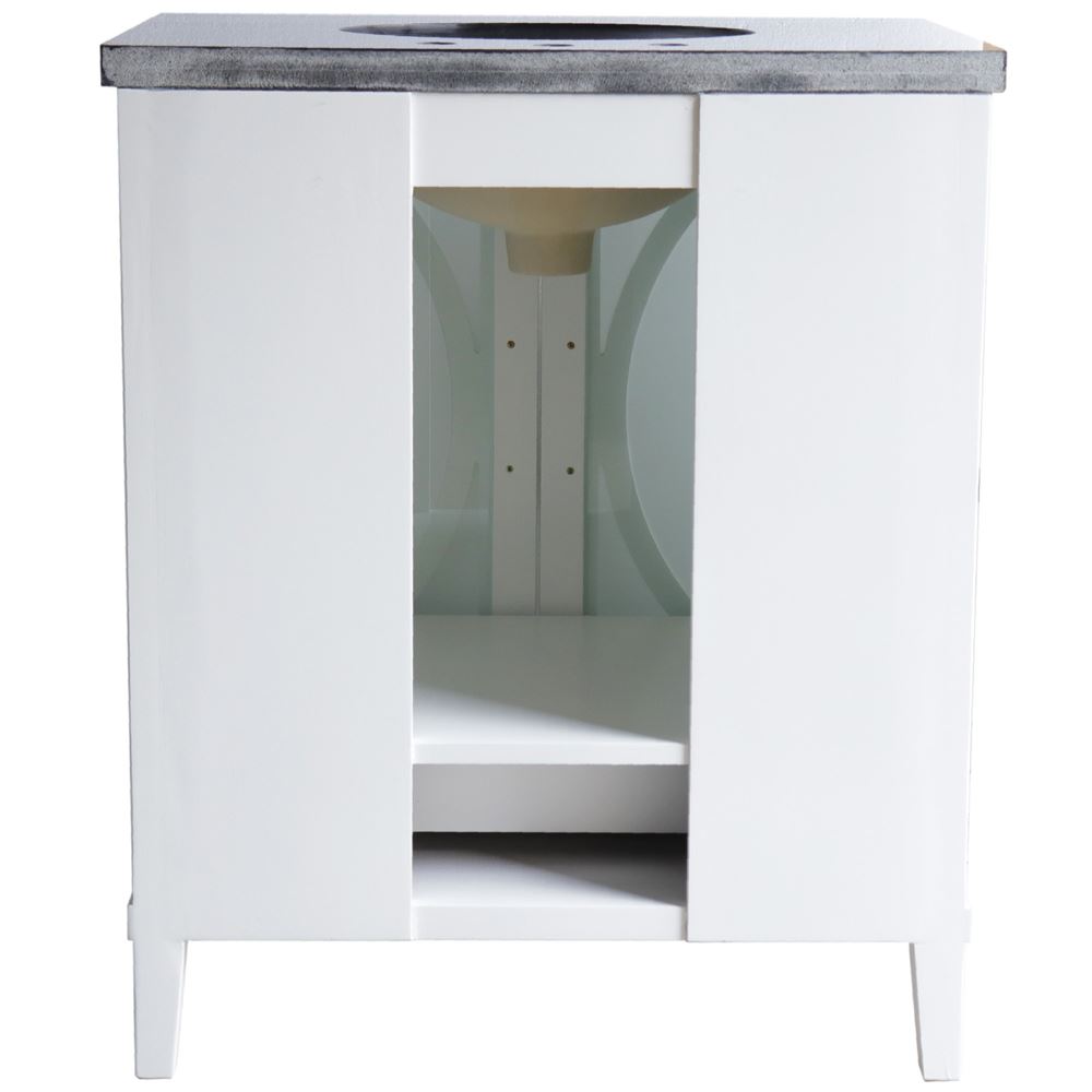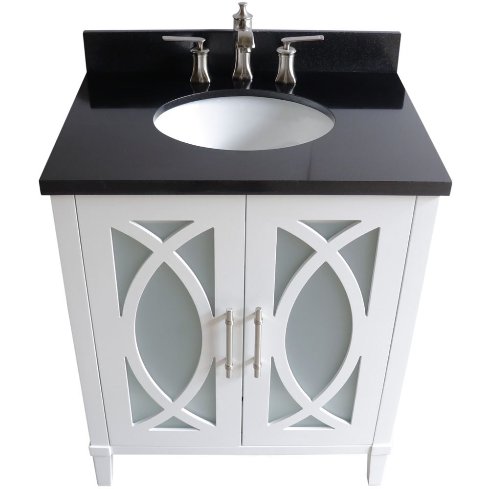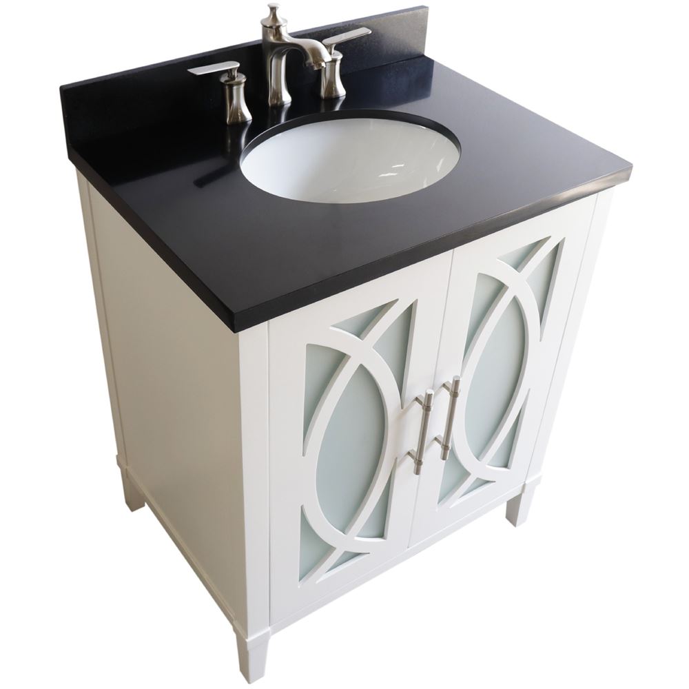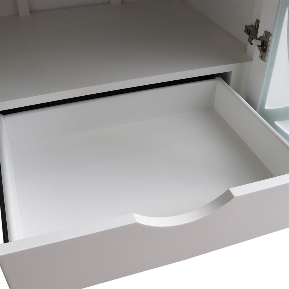 This stylish yet simple single sink vanity offers two beautiful glass inserted doors and one interior drawer. This gorgeous white vanity will be the focal point of your bathroom