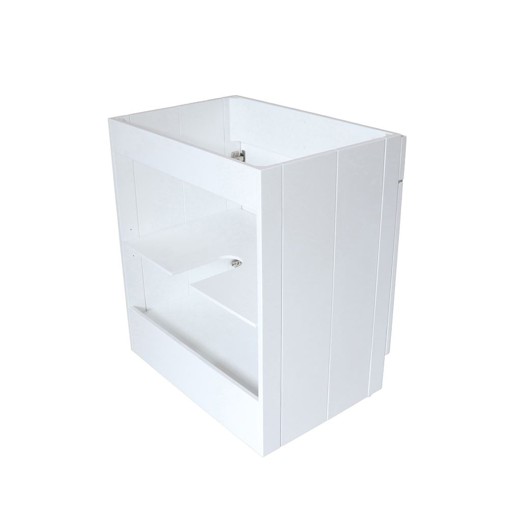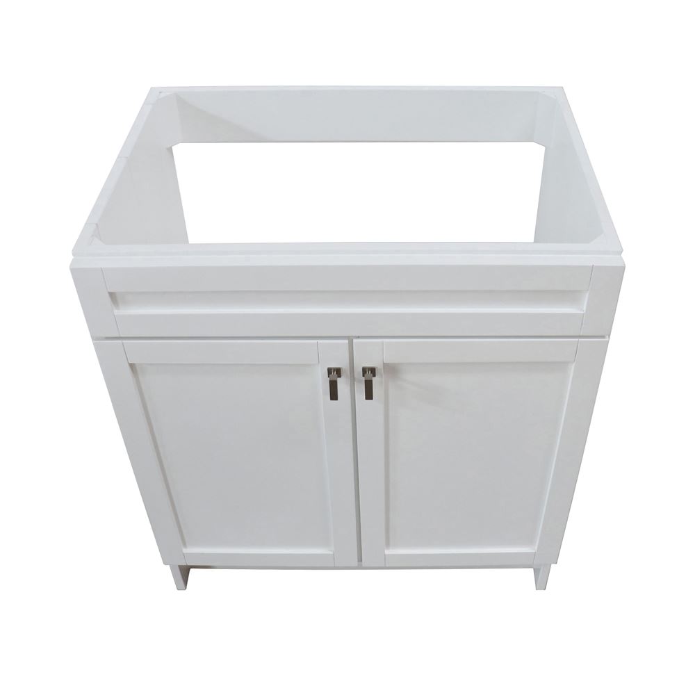 Elevate any modern living space with this 30 in. foldable freestanding vanity. Crafted from a premium blend of solid wood and plywood in a white wood finish, this vanity boasts exceptional durability and timeless beauty. Its compact dimensions and lightweight construction allow for hassle-free and toolless assembly. The opened back design ensures straightforward plumbing installation. Embrace convenience with shaker style soft closing doors, offering a seamless and noiseless experience. This versatile vanity also features an adjustable interior shelf providing 3 different storage options for your essentials. This cabinet is available in 3 different beautiful hardware finish options: matte black, brushed nickel, and brushed gold.